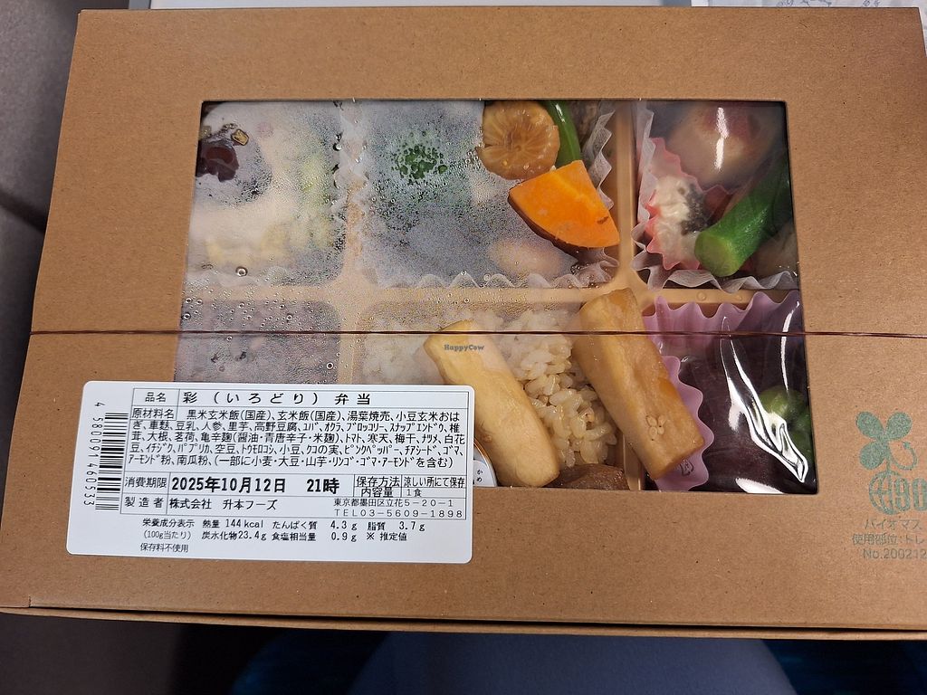 They had two vegan bento boxes. Here is a photo and ingredients of the larger of the two, which was 1250 yen.