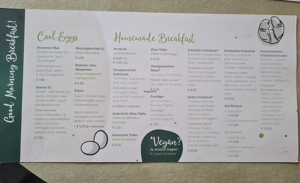Klar deklarierte vegane Speisen, toll gelegen mit Sitzmöglichkeiten im Freien. Frische Produkte, schön angerichtet! Das Porridge war mega! Leider war das Personal nicht ganz auf Zack, obwohl es zu unserer Zeit wenig besucht war. Das Brot kam erst auf Nachfrage, Service eher schleppend, dennoch sehr nett!