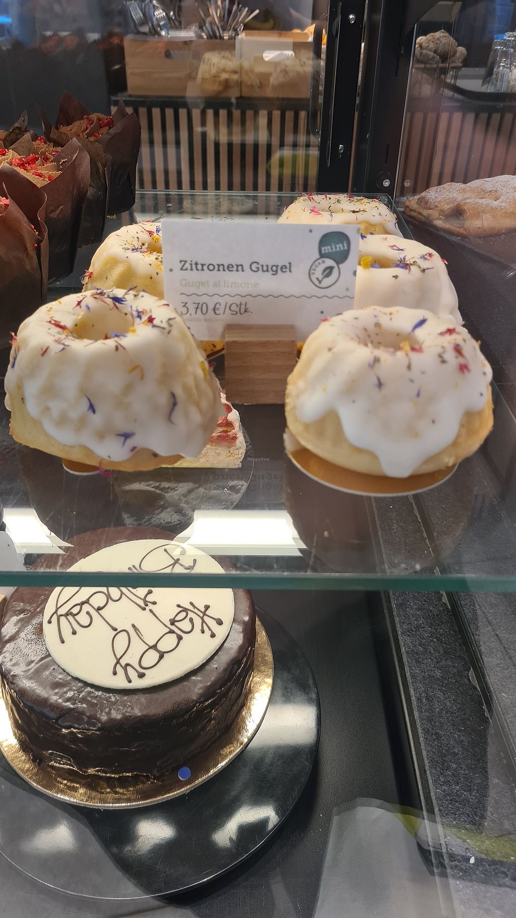 Die Bäckerei hat eine große Auswahl an Brot und Gebäck. Auch ein nettes Café und ein Außenbereich sind angeschlossen an die Bäckerei. Vegane Produkte sind klar markiert.