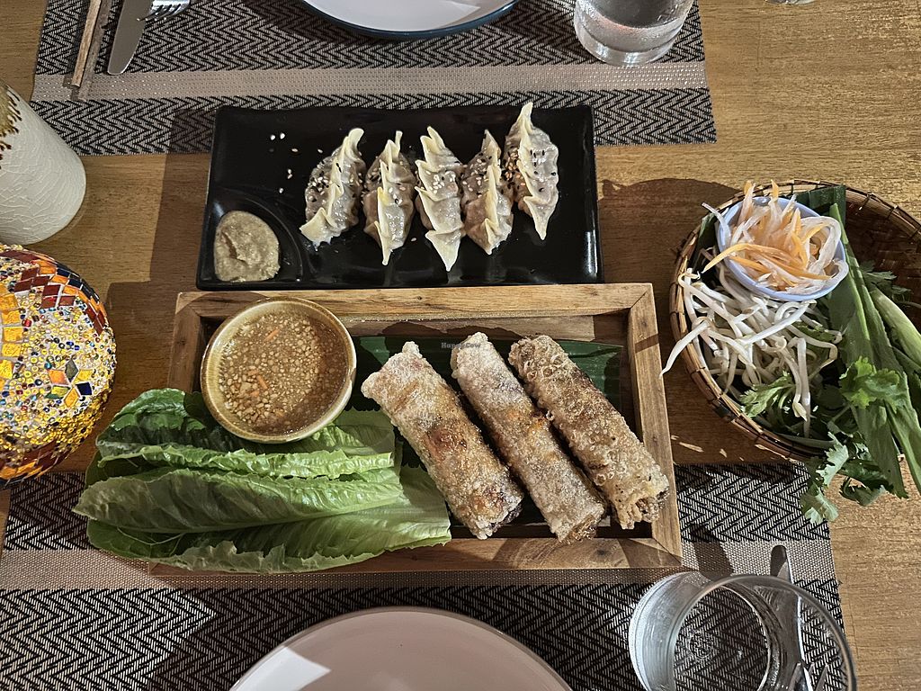 Serves meat, vegan options available. Vietnamese fusion restaurant in Baan Sukreep hotel. Offers marked vegetarian dishes that are vegan or adaptable, including pho, gyoza, fresh spring rolls, curries, sides and more. Specify vegan when ordering. Open Mon-Sun 12:00pm-10:30pm.