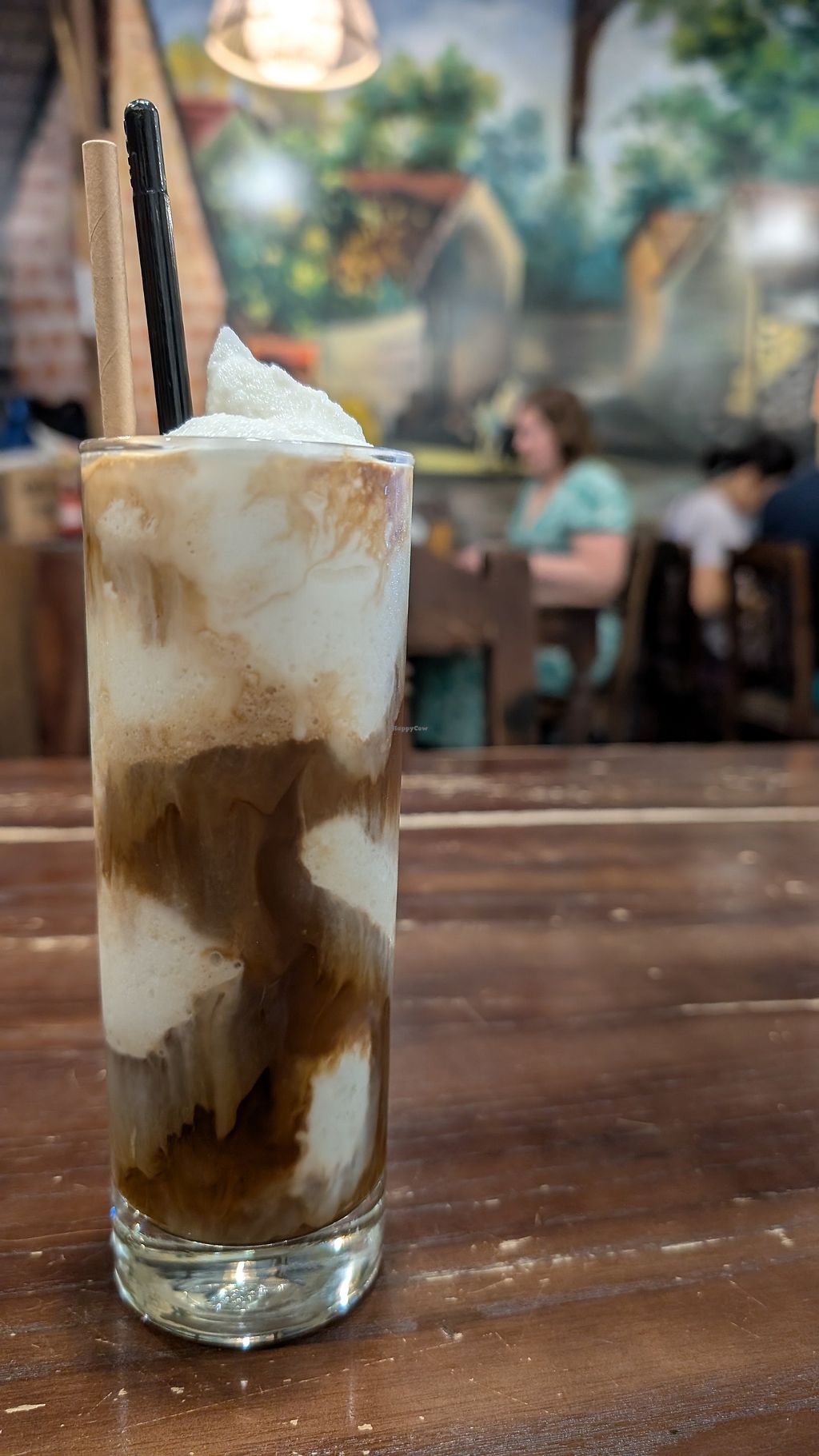 Yummy Vegan Banh Xeo (Rice pancakes with noodles, tofu, veg, herbs and sauce) and coconut coffee, in a noisy, busy restaurant.