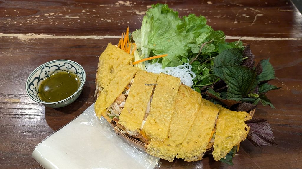 Unfortunately I don’t agree with the incredibly high ratings on Google and here. Fyi: there are 4-5 METs in Hanoi, all with the same menu. I love that this place offers vegan options next to the regular Vietnamese fare. I also enjoyed the service of Alex, who was friendly and quick. Unfortunately, I didn’t love the food. I ordered the vegan banh xeo aka Vietnamese pancake. It came out within 2 minutes, which was a bit too fast for it to be fresh. Unfortunately this was true - it arrived at my table cold and hard. The pancake itself was crunchy, like a taco shell, the filling was cold. The salad and herbs that come with it were nice and fresh though, the sauce was nice as well. It seems that certain foods get pre-made at the beginning of a shift and simply served whenever necessary, not made fresh to order. This provides fast service but makes the quality and taste suffer.