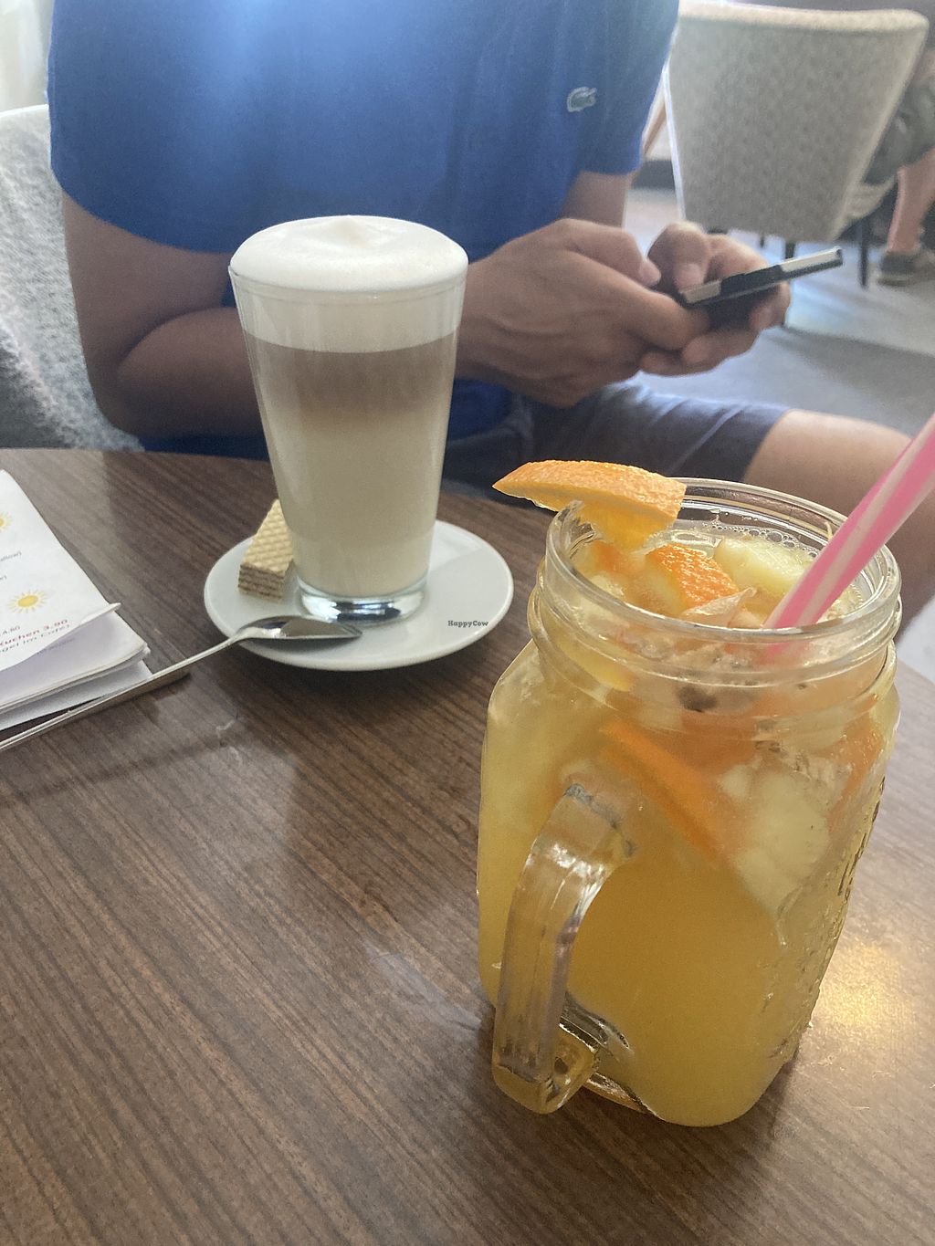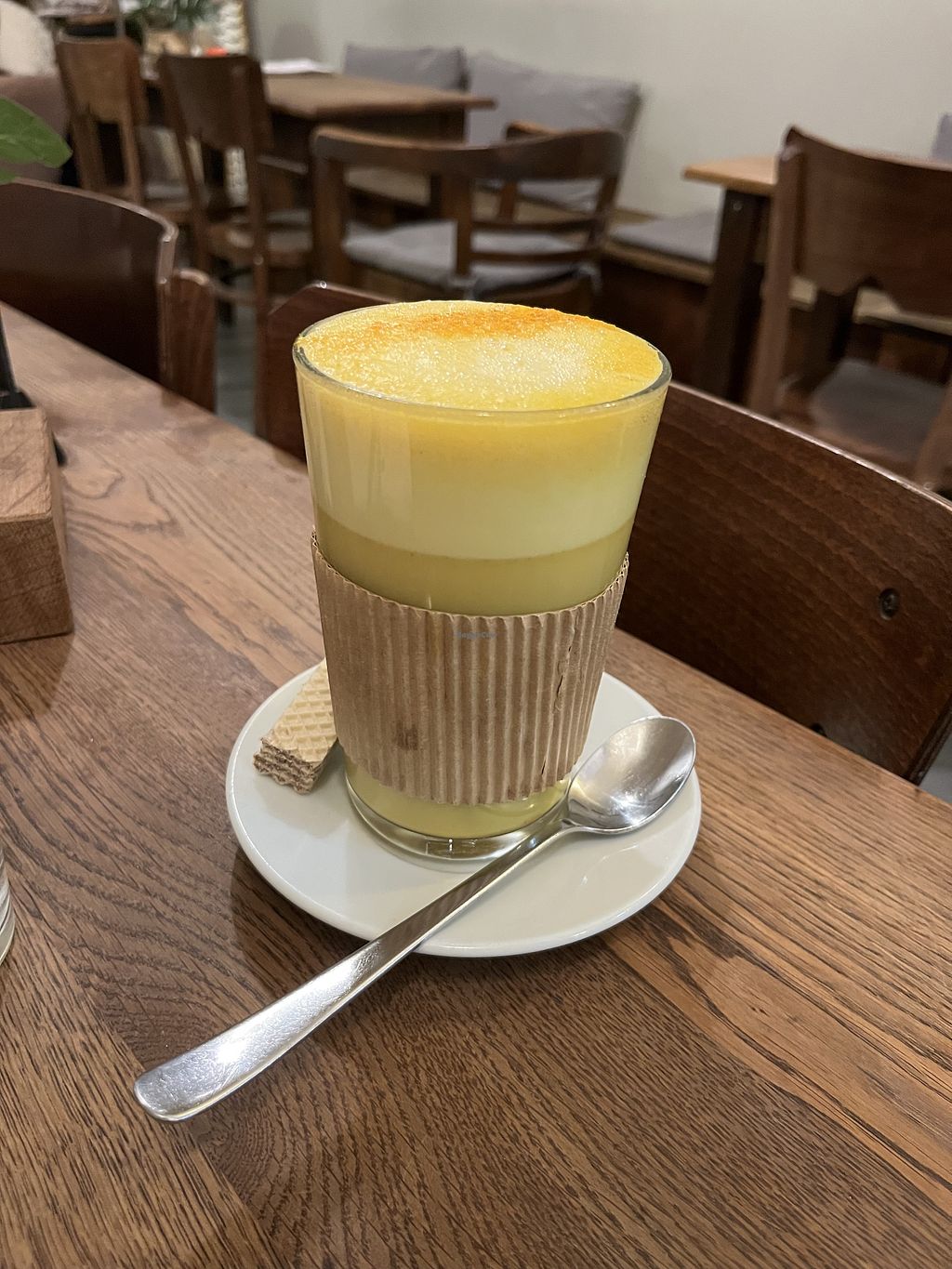 The café offers coffee, tea, and similar beverages. I like that they made some of their teas themselves, e.g. with fresh mint, fresh ginger or fresh lemon. A couple of the drinks can be veganized with plant milk, although that costs 50 cents extra... Soy milk was listed on the menu, but only oat milk was available.