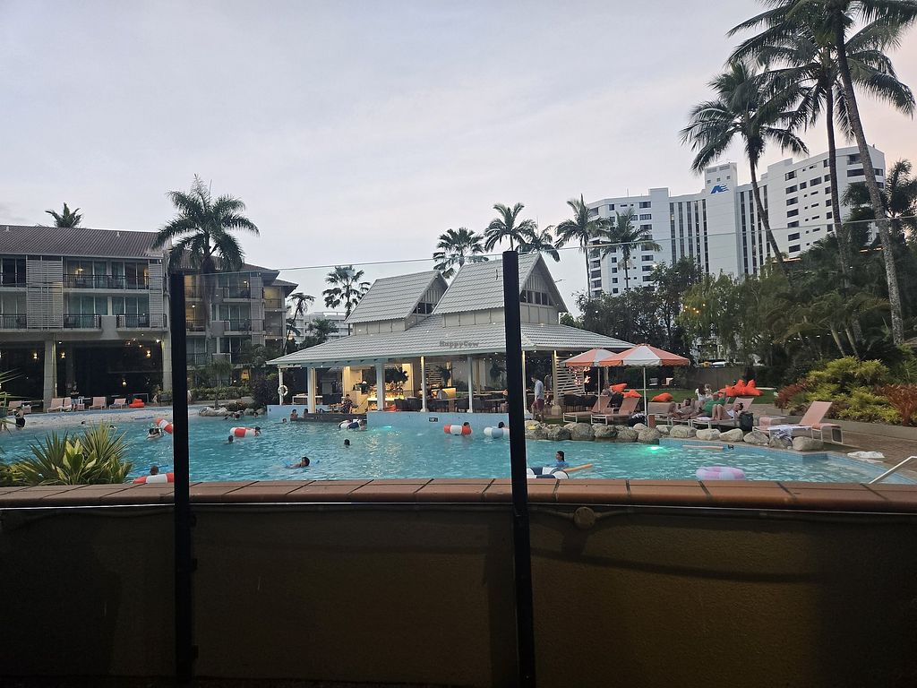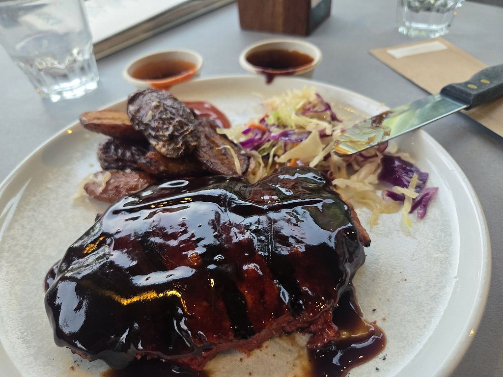 We went to Moku for a good dinner and were a little let down from our expectations. The restaurant is in the rear of the Novotel Cairns and we walked through the lobby to access. At the bar, we were informed we could pick any available table and order there by scanning a code or come back and order at the bar. We took some menus and found a table. It was cleared/unoccupied, however there was a coin-sized blotch of green that looked like thick pesto- we really have no idea what it was, on the table. A staff member came over immediately (without being asked) and sprayed/wiped the spot. We ordered the handmade steak at the bar and waited with some water from a self-serve station. The restaurant area is next to the pool club and the area was quite loud with families. We also noticed the outside ground was quite dirty and could have used a power wash. Our food came out after a short wait and was served with a steak knife. The steak was very rubbery and dry (almost had a burnt taste). I went back to the bar and requested some BBQ sauce for the steak and ketchup for the potatoes which came out after a few minutes. Waiting at the bar to order was a pain and I wish I had tried ordering by scanning the table. The sauce was quite tangy and not what we are used to. Overall the steak was not great, and the coleslaw lacked sauce. The potatoes were decent. Unfortunately would not recommend, hopefully they can change their steak recipe. The restaurant/bar seemed like an afterthought for the hotel, taking a backseat to the pool club (not surprising as this is an extra cost).