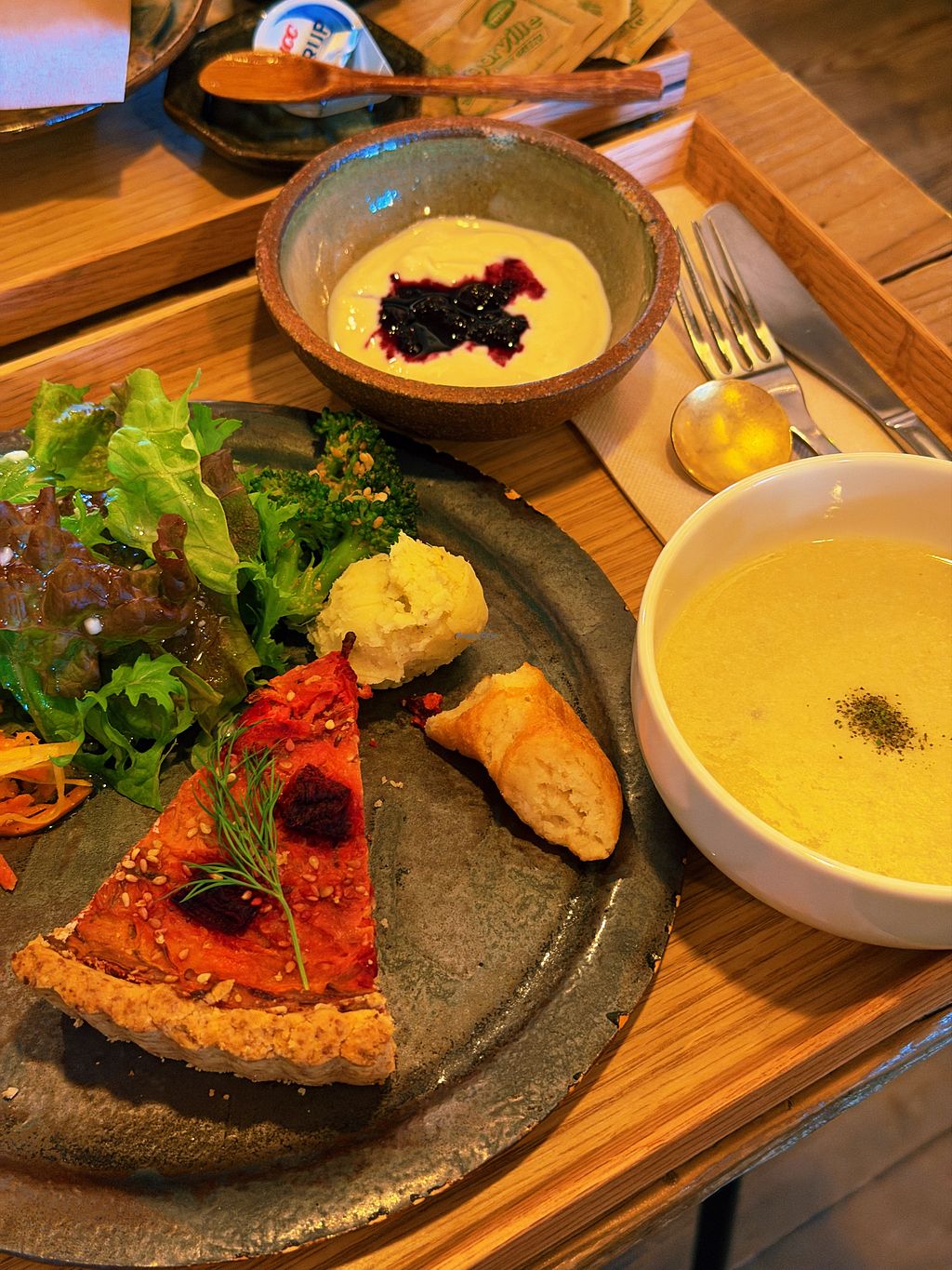 I got here right as it opened and immediately felt at home. I ordered the tofu doughnut which was delicious and the quiche plate. The quiche was the only thing that wasn’t a 10 out of 10, but it was still good. I just felt like it was lacking in flavor a little bit. But the meal came with pea soup, yogurt, and a side of vegetables as well that were out of this world.