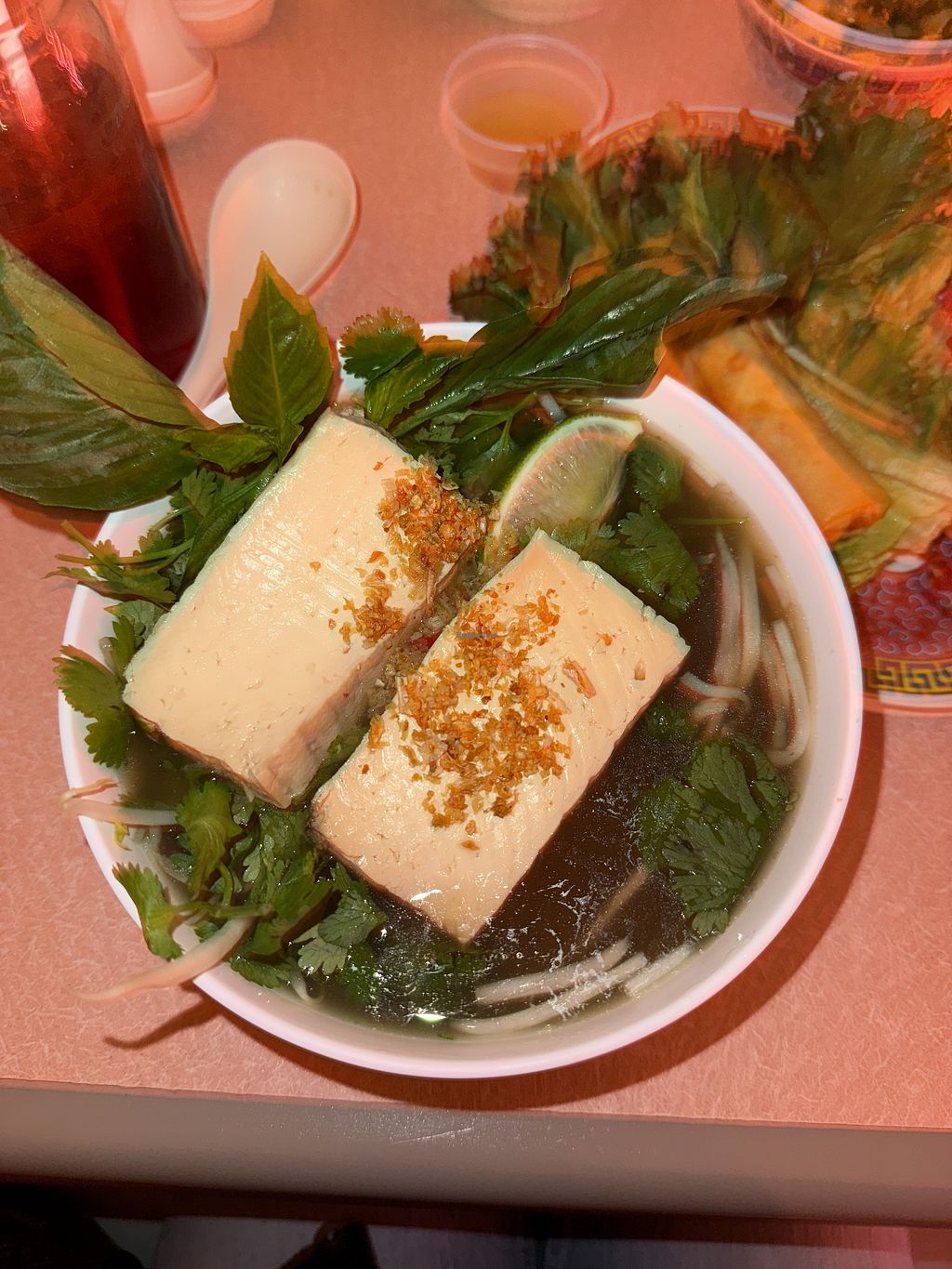 The veggie pho was so good! My non vegan companion said the broth tasted even better than the beef broth they had. The tofu was very flavorful. I’ve been here a second time since and also ordered the veggie spring rolls that comes with vegan fish sauce and that was crispy and delicious. The cucumber side dish was refreshing as well.