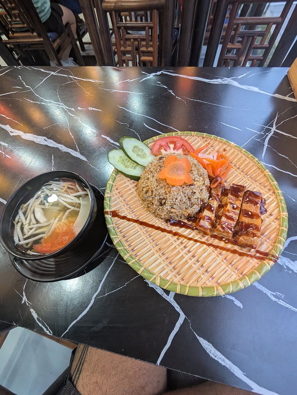 We tried the moon chay rolls, crab noodles, and broken rice with ribs. The rolls were okay, but lacked in flavour. The broken rice dish was underwhelming. It had nice parts but they did not fit well together. The crab noodles were the best and quite tasty. The ginger tea came with a tea bag and the lemon tea tasted ordinary. I guess there are better options than we had!