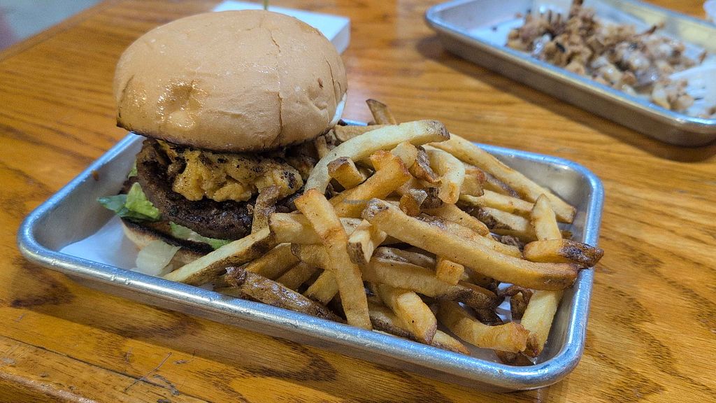 Food was so good! They offer Beyond, but they make their own burgers and cheese which I prefer. We had the BS Burger, Smoke Stacker, Fried Pickles, Parmesan Fries and wings. Everything was delicious!