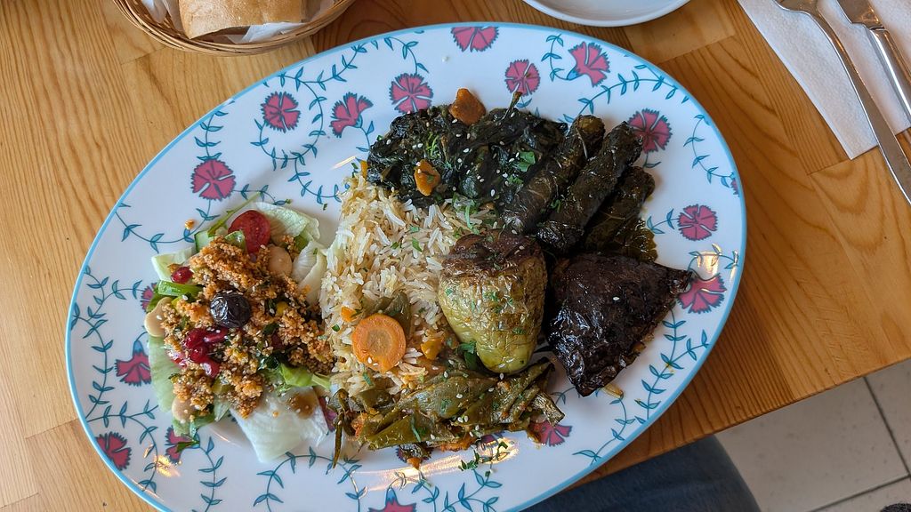 Serves meat, vegan options available. Bistro and café that offers a variety of dishes such as a small plate: Bulgur or rice plus two dishes; a normal plate: Bulgur or rice plus five dishes. Besides typical drinks also has Turkish tea, coffee, and beer. Vegan choices and/or others that could be made vegan can include rice, bulgur, mushrooms, grilled vegetables, filled wine leaves, filled peppers, green salad topped with couscous, olives, etc. (Vegans please inquire to be sure.) Open Tue-Thu 11:00-21:00, Fri-Sat 11:00-22:00, Sun 11:00-21:00. Closed Mon.