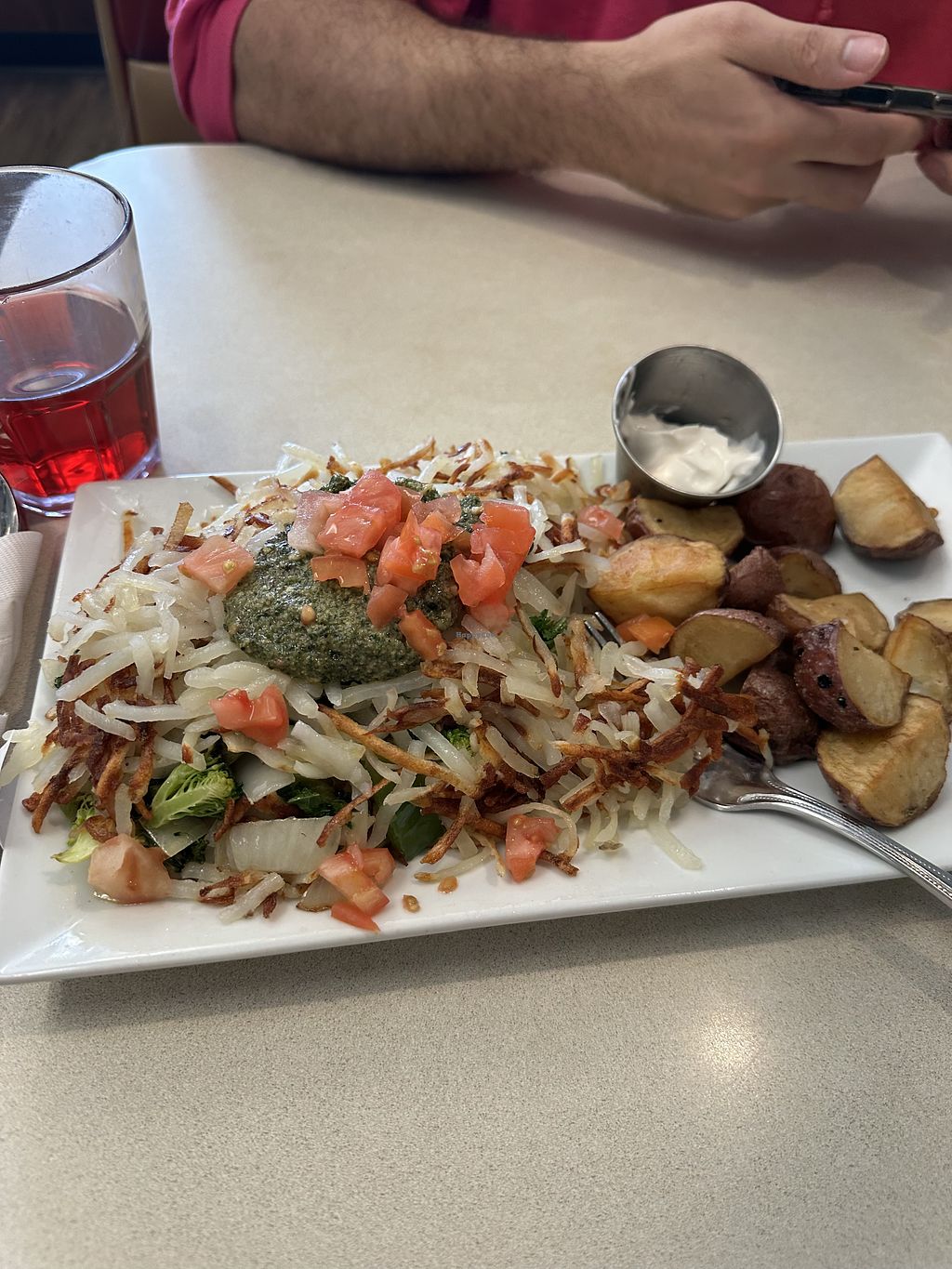First of all, this place not only has vegan OPTIONS, but a complete vegan MENU. And the choices are varied, very delicious, and our server Bella was great. In addition, the restaurant is spacious, very clean, and the bathrooms (a primary barometer of a restaurant’s quality for me), are spotless and well-maintained. I had a vegan garden hash topped with spiced tofu, and separately, a delicious vegan cinnamon roll. The garden hash could have used a bit more flavor, but it was nonetheless delicious. And the coffee was great!
