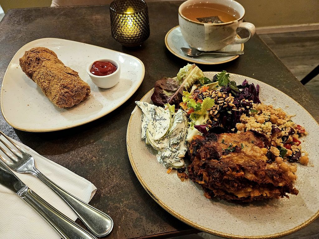 Read moreI had the lasagna which was okay, came with salads, but it cost extra to choose my own salads. Also tried the "corn dog" but found it was stuffed with lentils instead of a hot dog, which was... a bit disappointing? For dessert I had the chocolate cake, it looked pretty but was dry and not so good.
