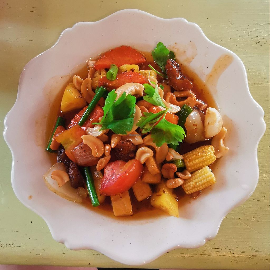 A lot of vegan choices with different soups, rice dishes, noodles. Half of the restaurants on the streets of Khao Sok have a "vegetarian" menu (all dishes can be vegan if you ask for tofu option without eggs / milk). This is the only one that has a vegan menu and vegan protein pieces (I think soy). Everything that we ate, was delicious.