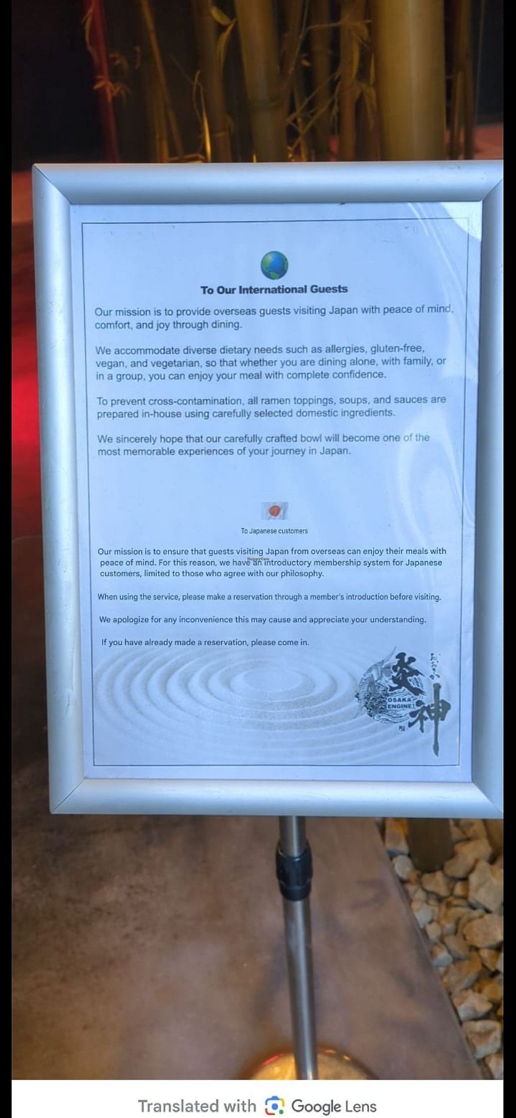 This restaurant has a sign in English and Japanese at the entrance. The English version explains they acommodate many types of dietary needs. The Japanese version says if you are Japanese you have to pre-register with them and "agree to their philosophy", whatever that means. That's just plain discriminatory and I refused to step inside this restaurant.