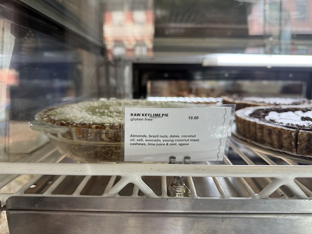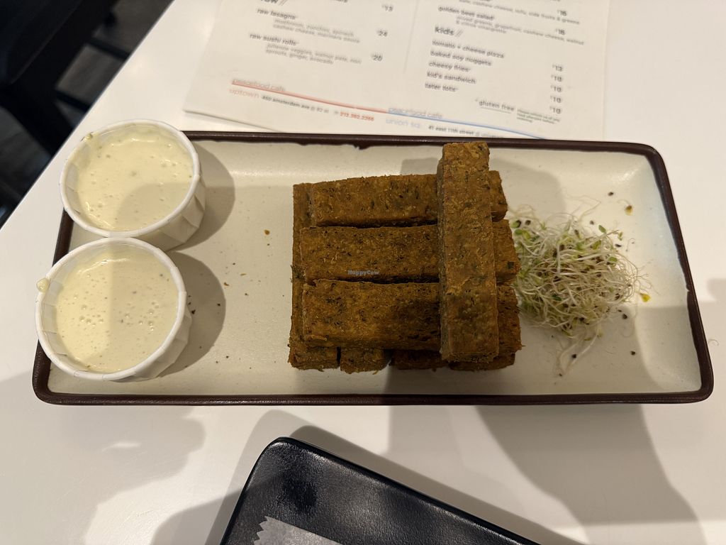 Lots of vegan choices, food was very tasty, and portions were large, especially for NYC. I had the chickpea fries for appetizers— it was very tasty but a bit spicy for me (menu did indicate that it had Indian spices) and was not oily at all. I had the pumpkin sandwich —it had a sweet flavor profile, but adding the tempeh (which was very savory) balanced it a lot. Spelt bread was fresh and hearty. Had a good selection of house-made vegan cakes and pasties, which I took home to share with my family.