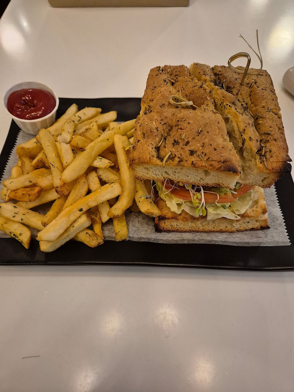 We had two sandwiches which were tasty, healthy, and very filling. Served with nice pickled jicama “fries”. Big selection of desserts. Will certainly be back for lunch and dinner.