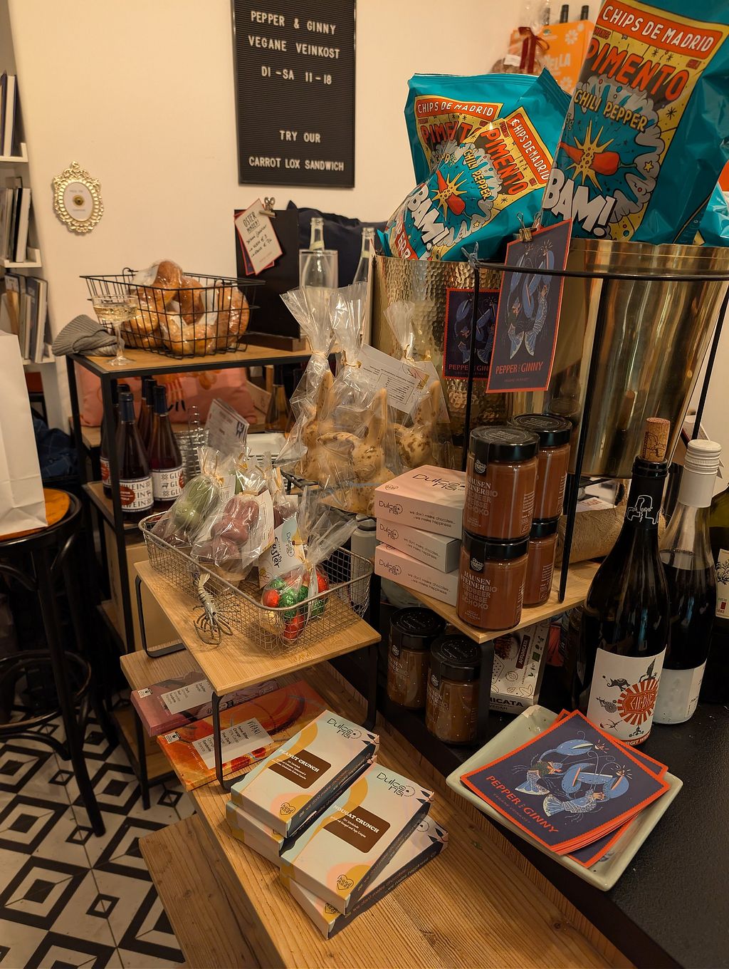 Ich war leider kurz vor Feierabend dort, aber ich konnte noch das letzte Gourmetbrötchen mit veganem Camembert probieren 🍞🧀. Einige spannende Produkte, die es sonst nur online gibt. Es gibt dort übrigens auch Schokoladen und Pralinen von der Dulceria 🍫 oder Produkte von Hut & Stiel 🍄🟫.