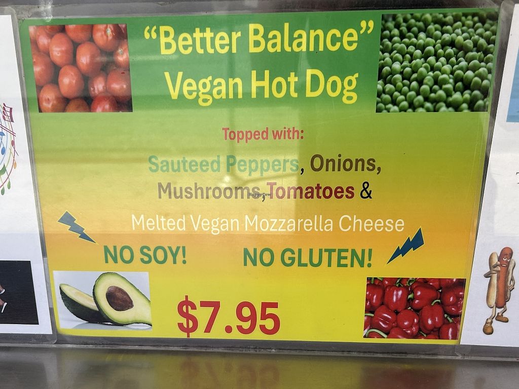 Pink's offers one vegan hot dog: the veggie beyond dog. It has guacamole and mustard on it and of course a beyond sausage. It was really fine, for about 11 dollars maybe a little bit pricey.