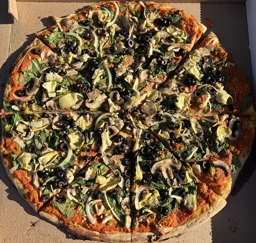 amazing sauce, amazing cheese, great faux meats and delicious crust! best vegan ‘za i’ve had in a while. the 20” pie is HUGE!!!