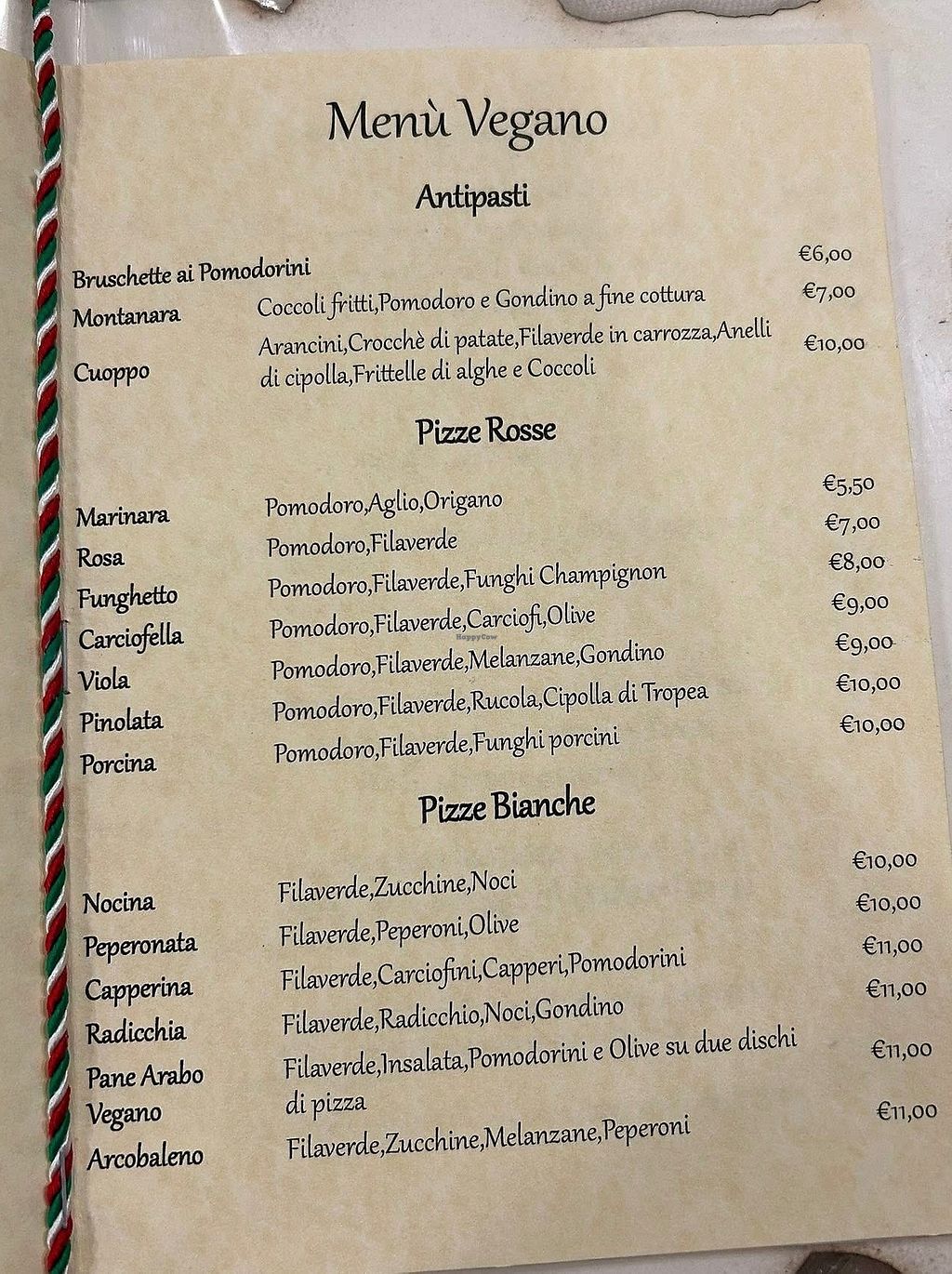 Serves meat, vegan options available. Pizzeria offering a vegan menu with a variety of antipasti, pizzas and desserts. Examples of vegan dishes include arancini, bruschetta, pizzas with different combinations of vegetables, tomato sauce and vegan mozzarella. Open Tue-Sun 18:00-00:00. Chiuso il lunedì