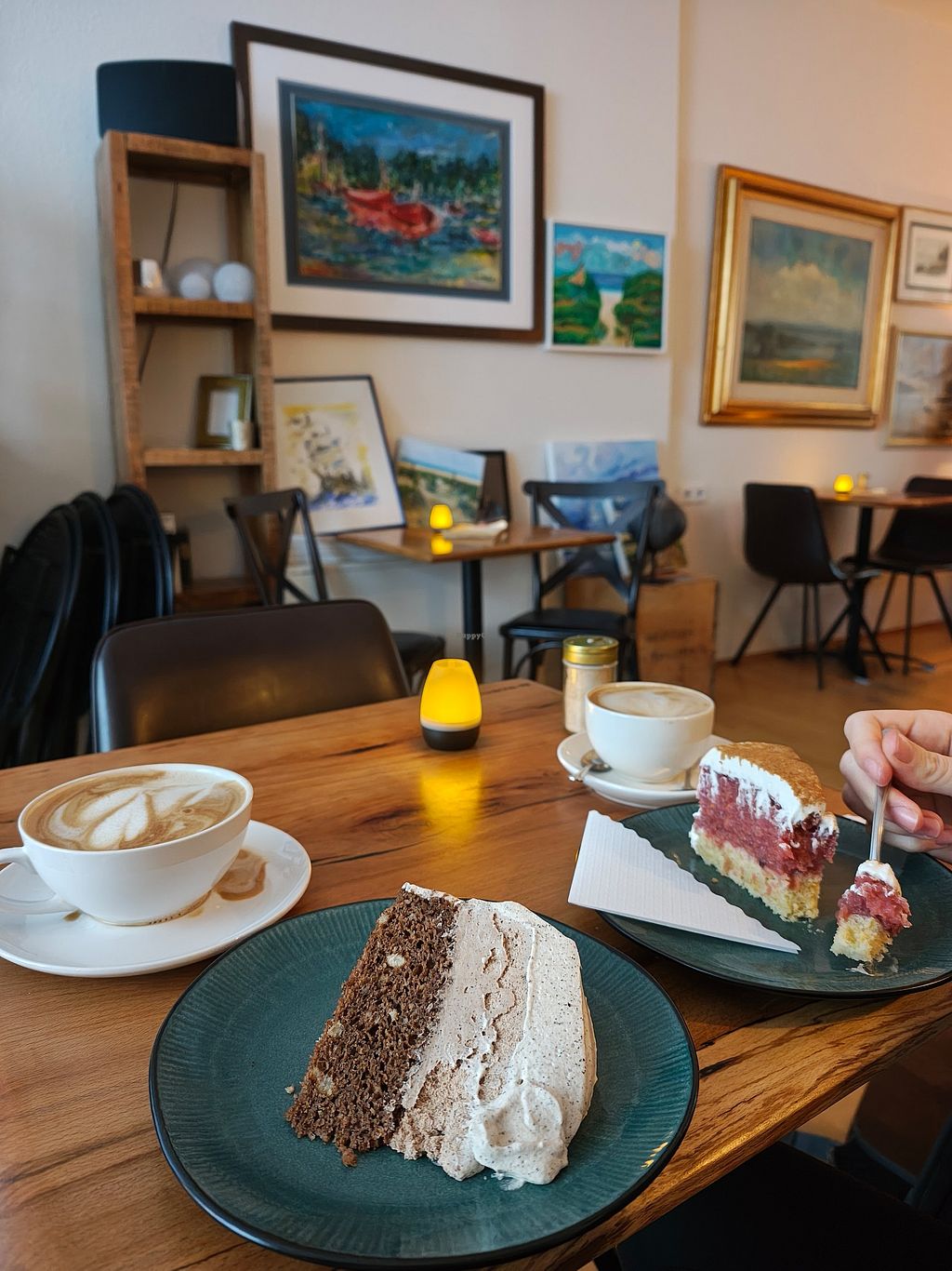 Super schönes Café mit toller Kunst, die man bestaunen kann. Große Getränkeauswahl und leckerer Kuchen und Torten. Veganer Himmel ☺️💛