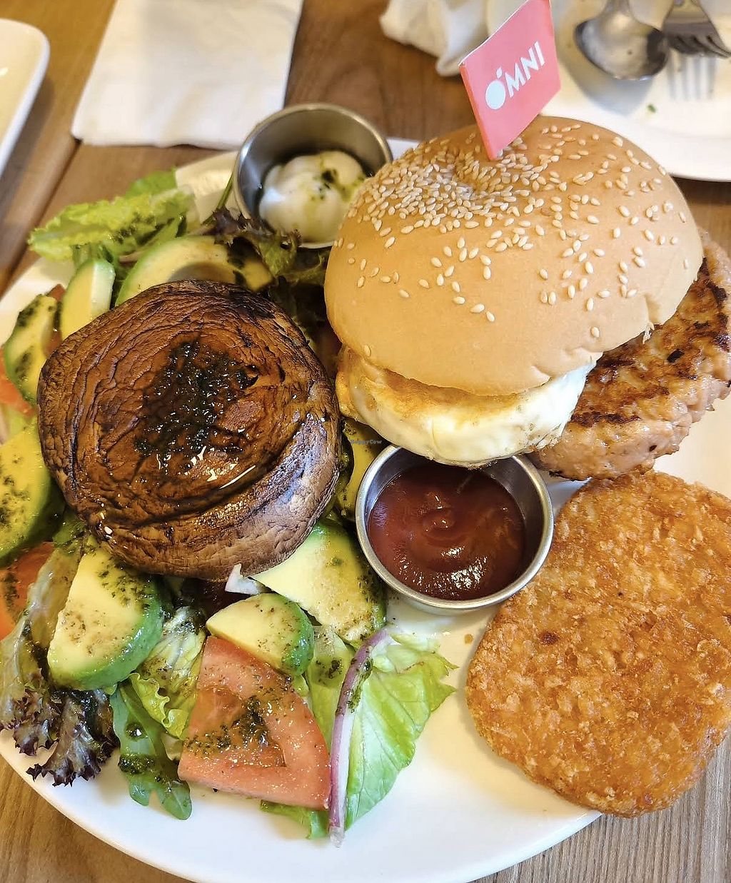Read moreOrdered an Omni Combo (sausage egg muffin, portobello mushroom salad and a hashbrown) and a Mini Burger Set (burger, "chicken" cheese spinach wrap, and a falafel salad).