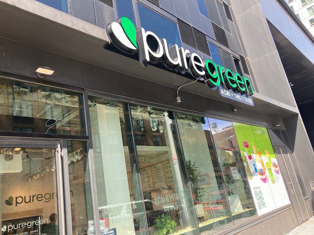 This is a small juice place from a dependable juice franchise, mostly for takeout (though with a few places inside to sit). All here is vegetarian, and mostly vegan (with the vegan items clearly labeled). I had a juice here today; I have found the wares at Pure Green places to be always quite good.