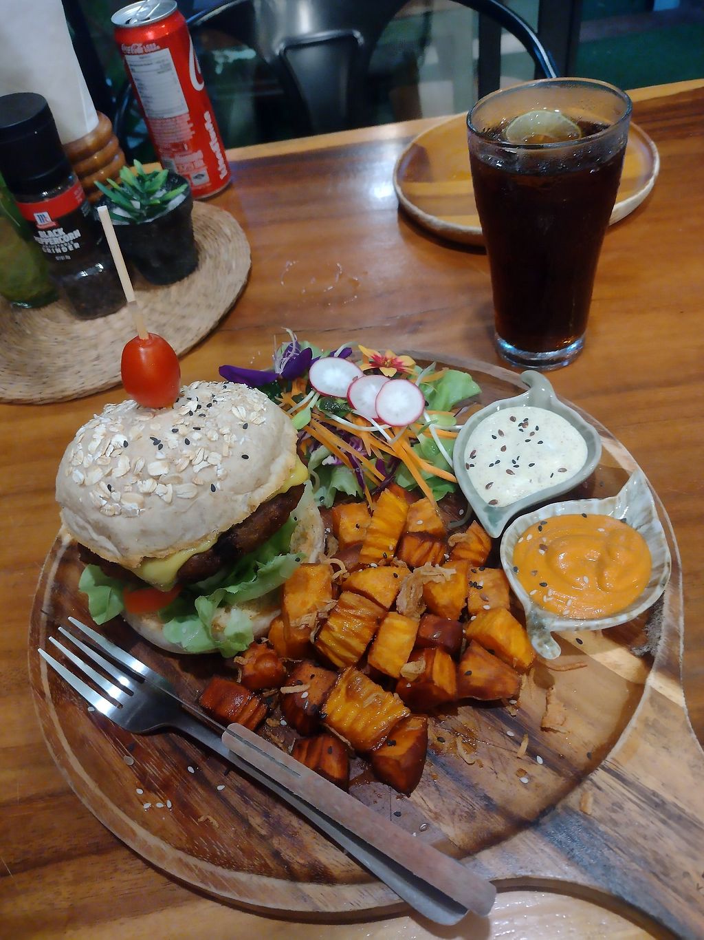 Cons: Many mosquitos , Bean burger didn't really have any flavour