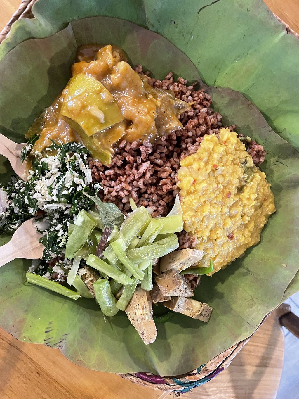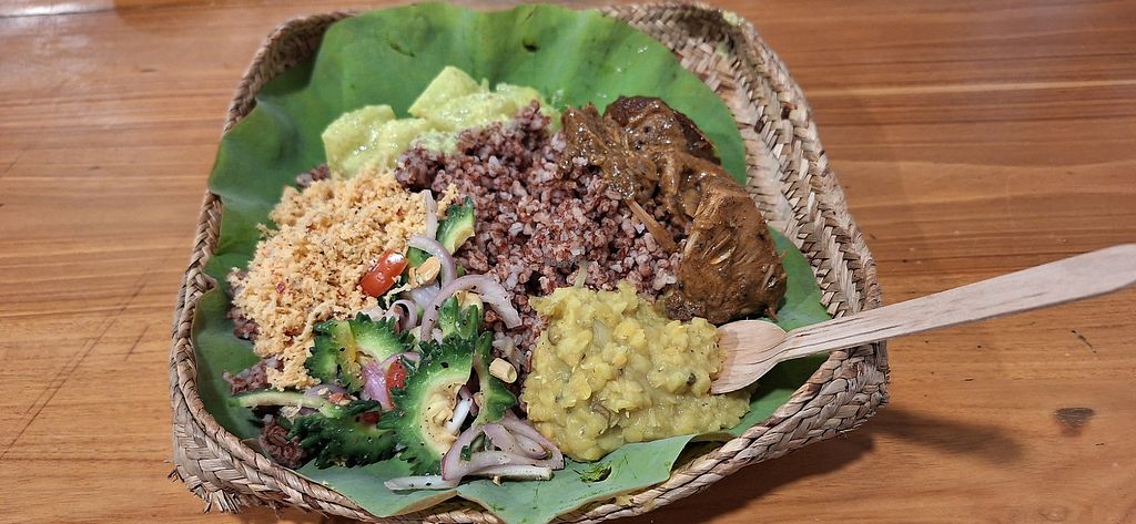 Has a large variety of curries and vegetables which are all prepared in the local authentic style. The taste is amazing. You can try all of them with rice and local snacks. The curries are all on display so you can see what you like and choose. The staff is really friendly and can help you choose if you're confused. Finally the price is also very fair and not marked up due to being vegan.