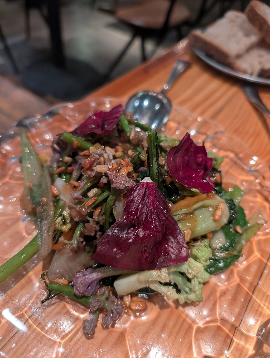 Really lovely and accommodating staff. Three course menu for 35 euro each, and they encourage sharing. My favourites were the sautéed vegetable starter and pointed cabbage main. Desserts were really interesting and delicious. I had a local orange wine at the server's suggestion.