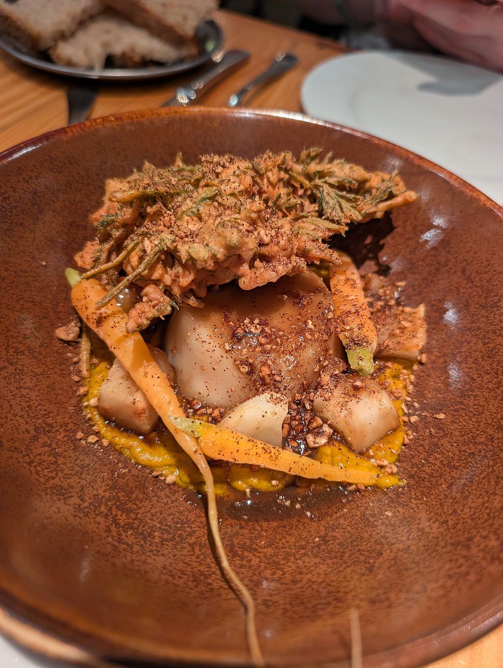 Rasoterra does amazing high-end, local ingredient based, vegan food. The menu is changing all the time, but we've had great meals both times we've visited. They also have a large variety of natural wines and wine pairing for your meal. A great date night or special occasion destination.