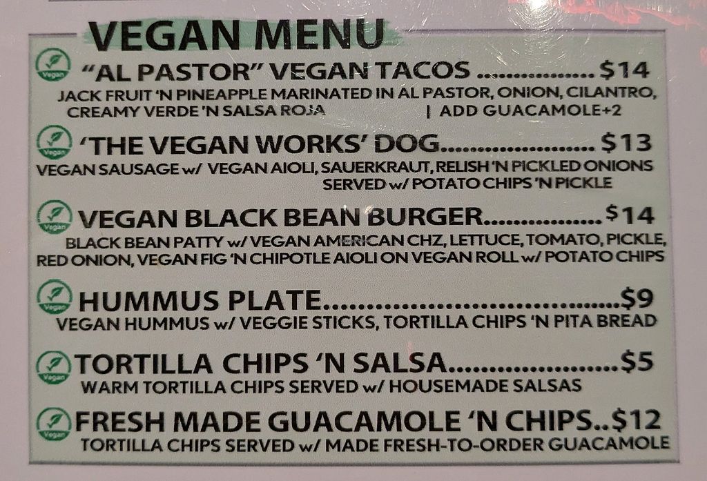 Serves meat, vegan options available. Restaurant/bar with a vegan menu section which includes tacos, hummus, a burger and others. Has live music. Open Mon-Thu 12:00pm-10:00pm, Fri-Sat 12:00pm-12:00am, Sun 12:00pm-10:00pm.