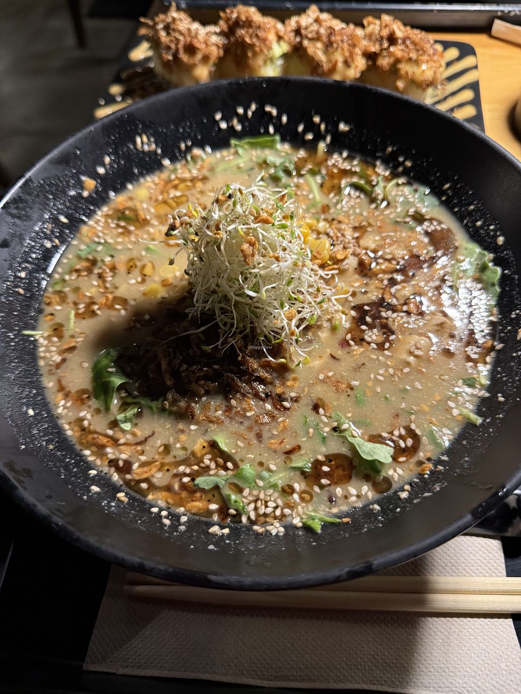Loved my Yuzu Sesame GF ramen and roasted miso avocado roll. Asked for no added salt or oil. Delicious. Creamy. Full of soy meat, tofu, crispy onion, arugula & alfalfa.