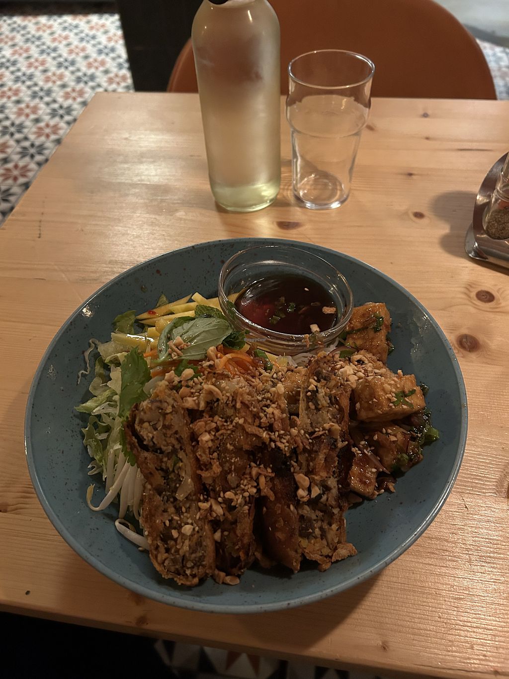 I had a dish with spring rolls, fried tofu and noodle salad. The taste and consistency - reaaallly crispy spring rolls - was to die for! Vad i hela himmelen, huuur gott som helst! Cozy place and friendly staff too!