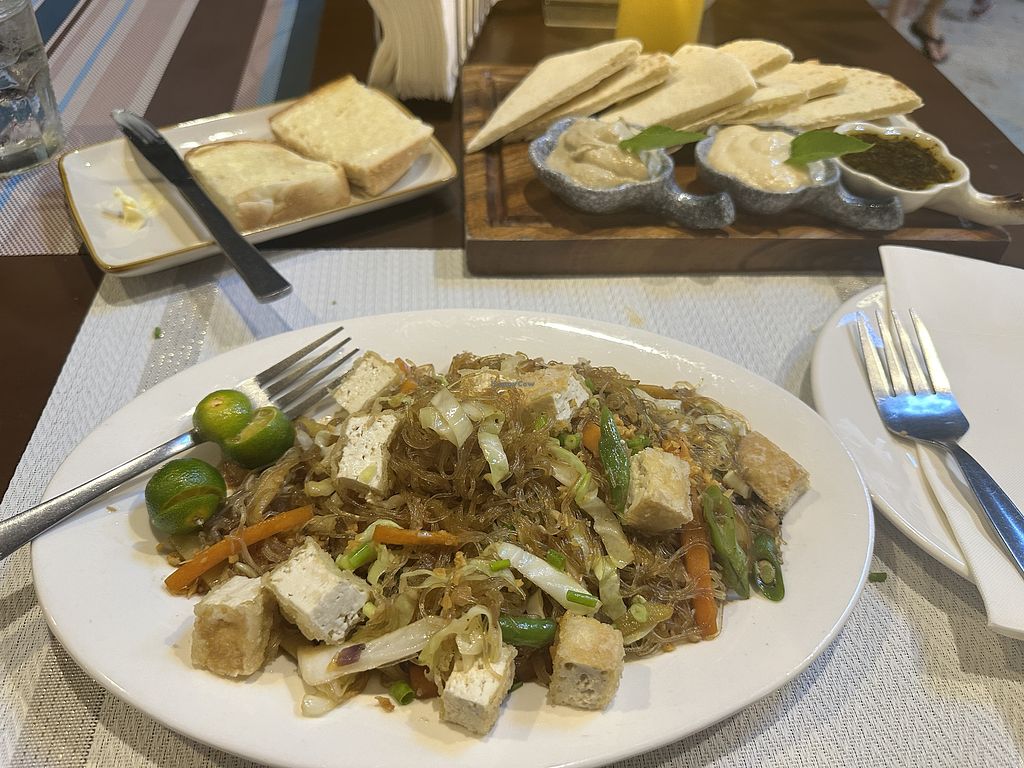 I tried the vegan pancit which is a local noodles dish with veggies. Great flavours and large portions. Affordable prices for this great location. Happy hour at Sunset (2 for 1)