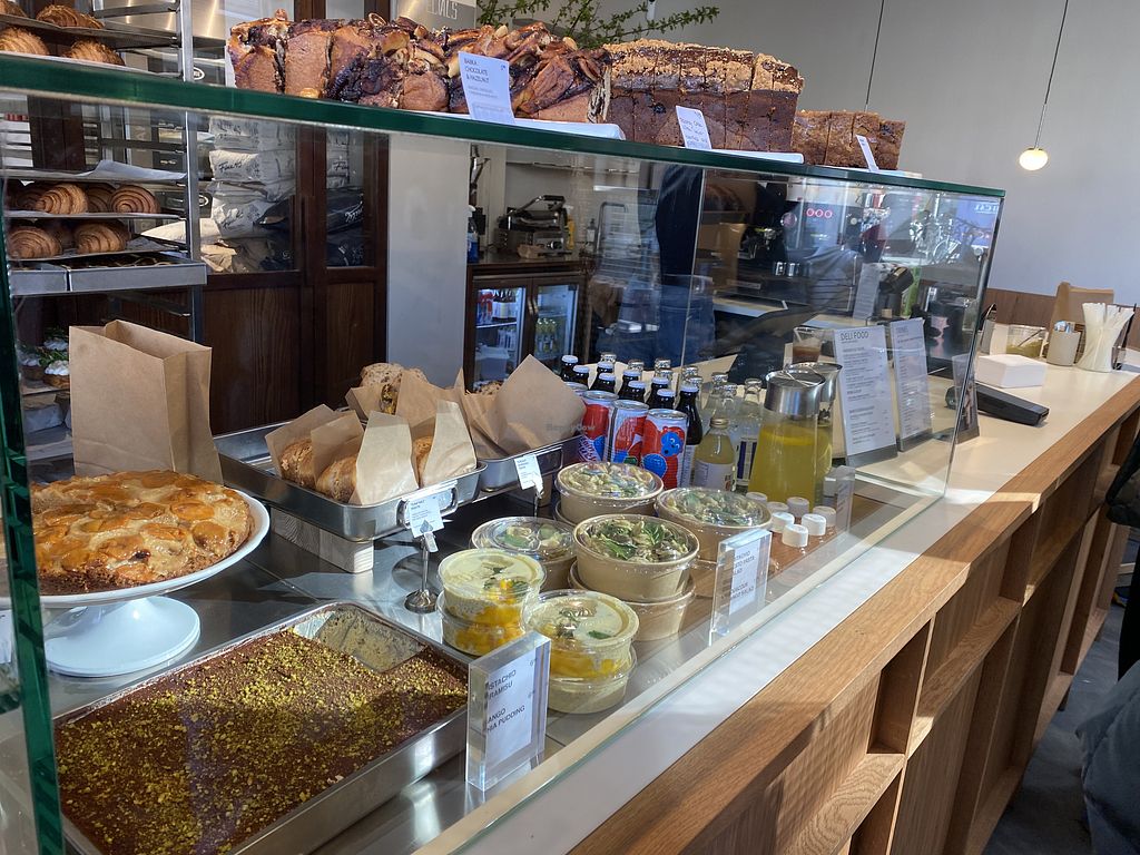 Delightful vegan pastry shop with coffees and pistachio soft serve ice cream. The tuna sandwich was awesome and felt like the real thing. The pastrami with mustard was nice too. Good creamy coffees. It was an operation trying to get a seat so we could enjoy our coffees. They say you need to order first before sitting but then you can’t be sure to get a table. Luckily we managed and brought sweet pastries from their place opposite as well. Yum! I’d love to try everything on the menu.