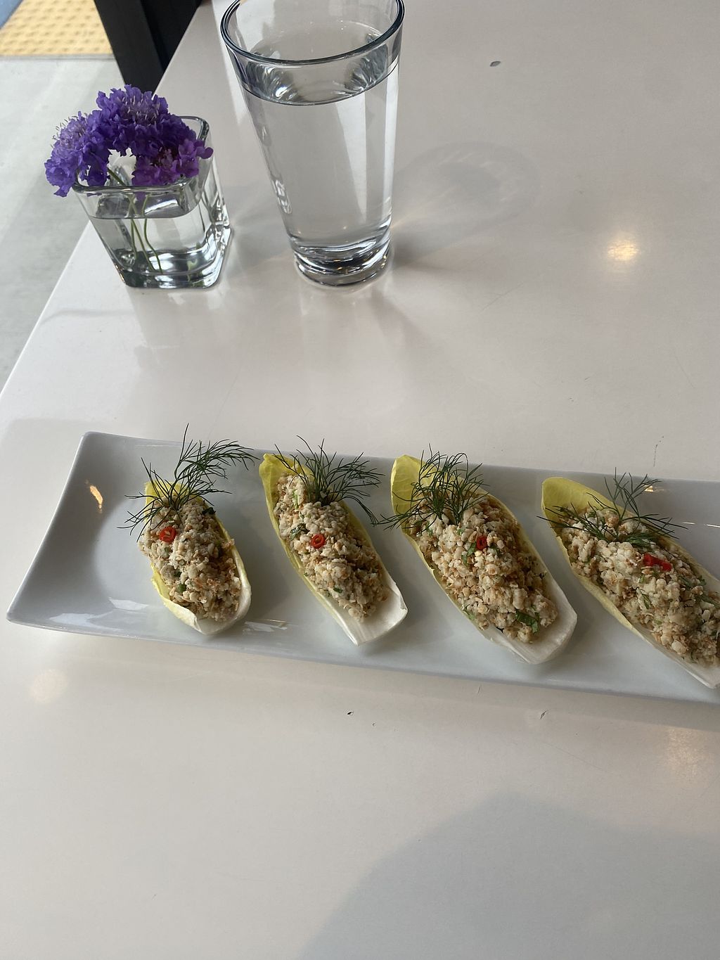 Read moreWe got some endive cups, which came with some cold tuna-ish salad, that had coconuts and cashews and was yet quite spicy. Absolutely loved it. We got a shallot, tempeh stir fry with rice which was also amazing, the sauce was garlicky and just slightly tangy to round it off. The kabocha squash soup with ginger felt pretty good on a rainy evening.