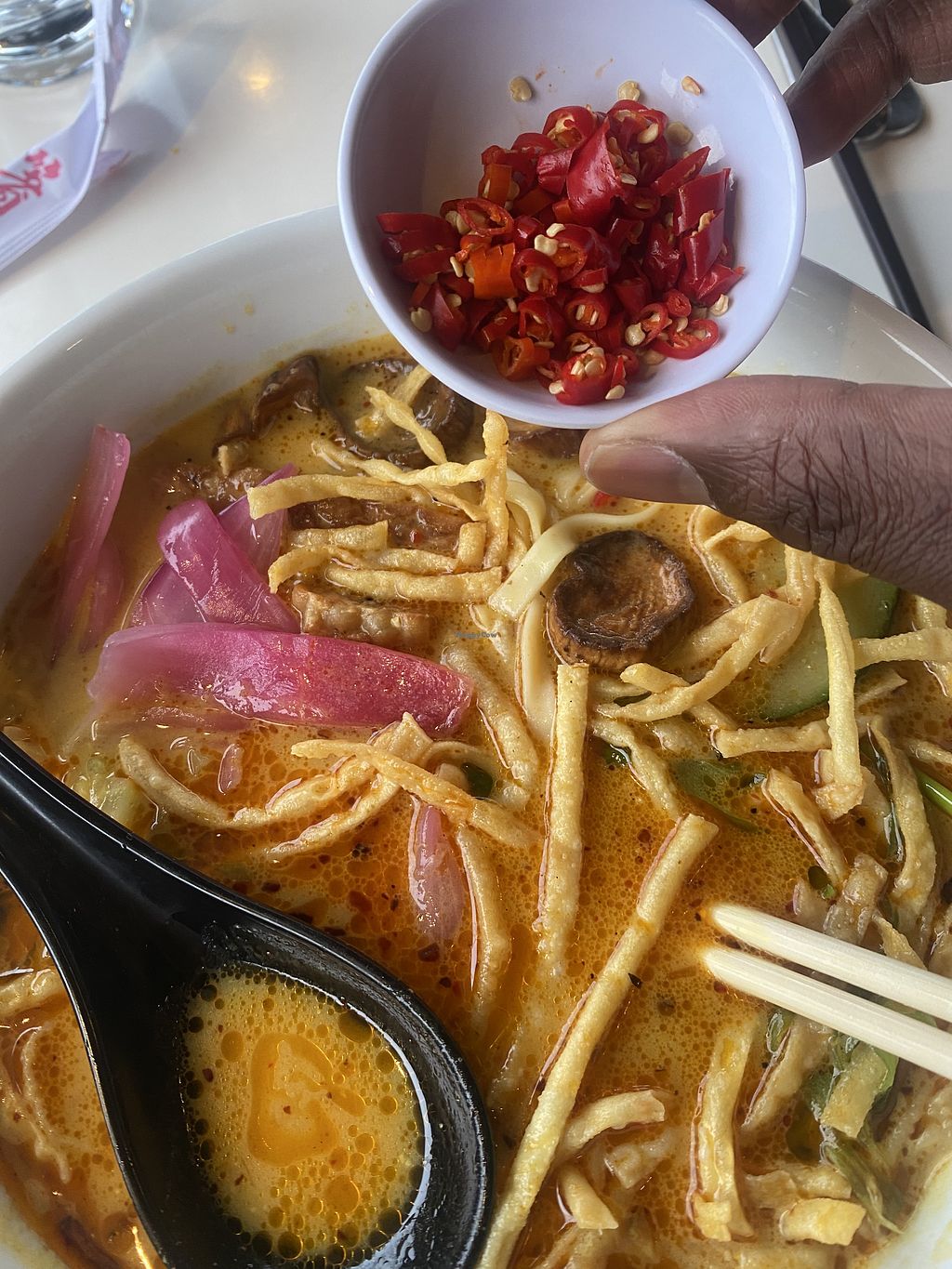 I ordered the Vermicelli with mung bean coconut curry peanut sauce. The sauce was flavorful but they served the dish with way more sauce than actual noodles (see picture). I was also served more scallion onions than noodles. It was really confusing and ridiculous that we had to laugh about it just so when the check came it didn’t feel as painful. For $16 the price for the dish I ordered is just way too high for what is being served as a meal. We also ordered the pad thai and had a similar experience with small portions. I double checked their online menu gallery to see if it was a mistake but they advertise small bite portions.
