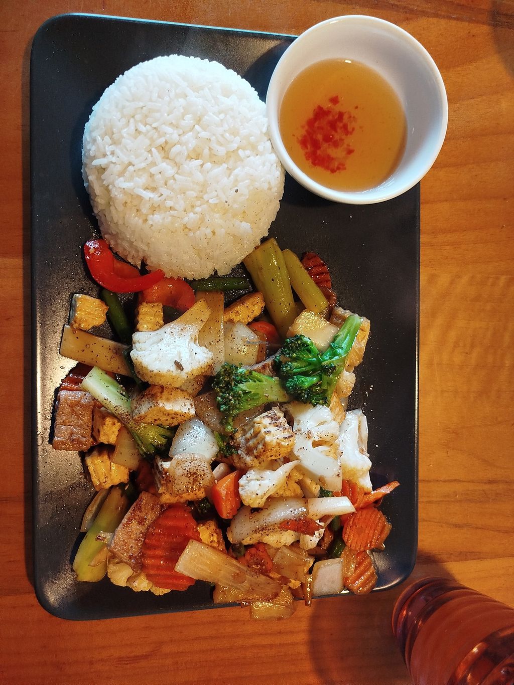 Restaurant offering mostly plant-based dishes like teriyaki tofu (tofu in sweet soy glaze with vegetables), pho (Vietnamese noodle soup with herbs and vegetables), bún huế (spicy lemongrass noodle soup), bún thái (hot and sour Thai-style noodle soup), and gà chay xào hạt điều (stir-fried vegan chicken with cashews). Open Mon-Thu 11:00-19:00, Fri 11:00-20:00, Sat-Sun 12:00-20:00.