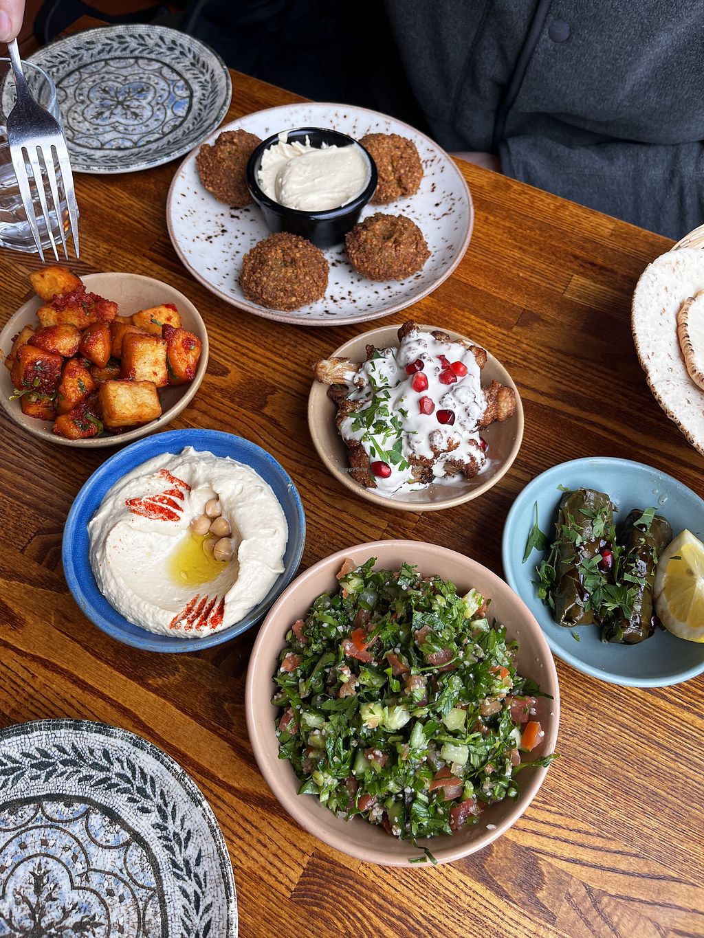 Serves meat, vegan options available. Middle Eastern restaurant offering vegan dishes such as classic zaatar, hummus, baba ghanoush, batata harah, stuffed vine leaves, falafel, cauliflower fritters, and vegan mezze. Open Mon 12:00-21:30, Tue-Fri 17:00-22:00, Sat-Sun 12:00-22:30.