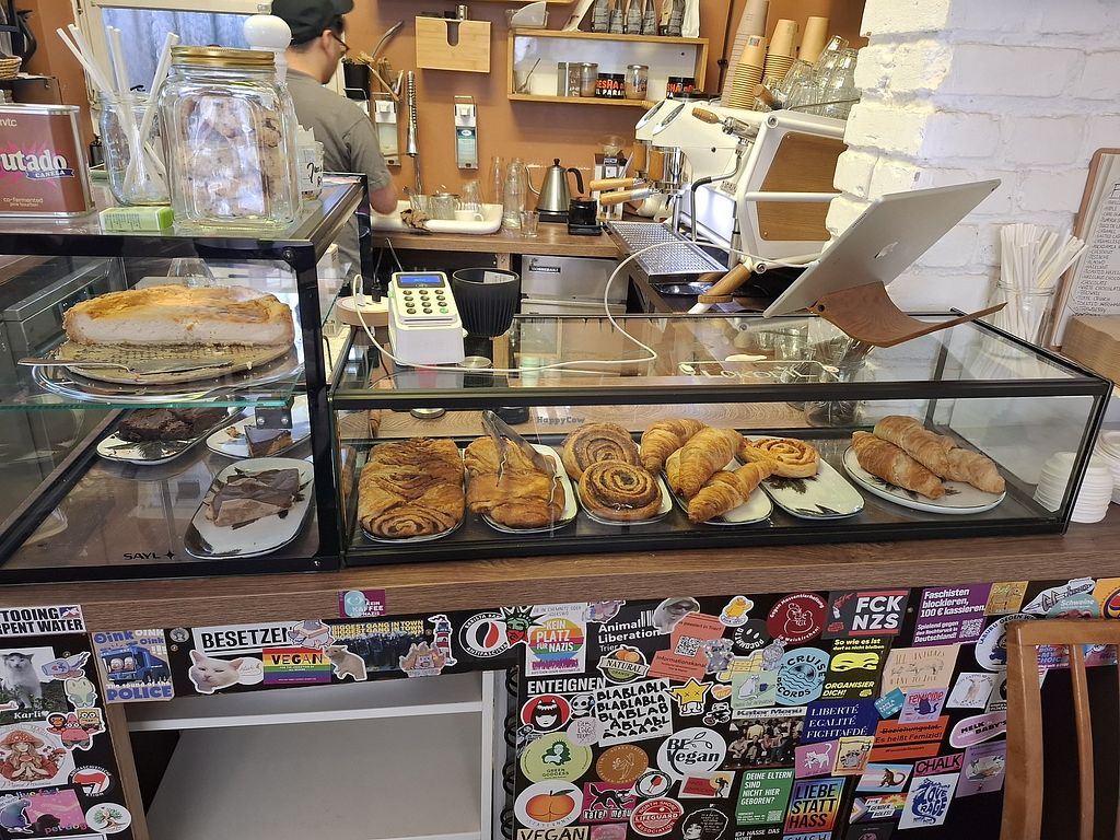 Wir saßen draußen an einem warmen Sommertag draußen und wollten frühstücken, aber ich sah zunächst nur Pizzaschnecken. Wir bestellen jeweils einen iced flavoured coffee. Ich wollte caramel crunch, hatten die aber leider nicht, egal brownie war auch sehr lecker. Hab nur gedacht, dass es etwas aufgefallener sei. Ansonsten hatte ich so eine salty peanut-chocolate bar, klein Aber mhmmm so lecker. Leider hatten sie auch keine Franzbrötchen, also war das eher wirklich nur ein Morgenkaffee, aber voll okay. Haben es genossen und alles vegan- das ist natürlich immer top.:)