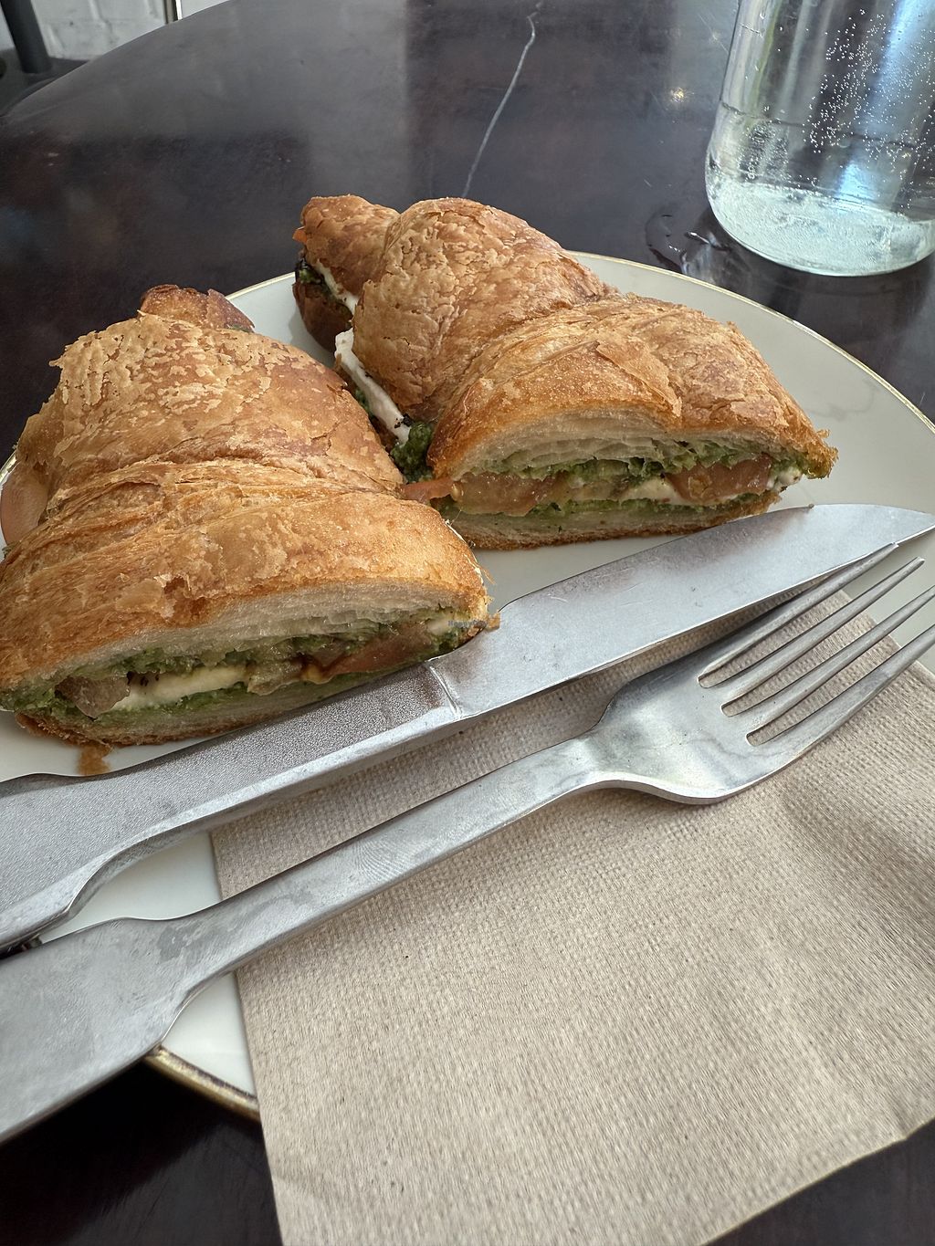 Eine Hälfte des belegten Croissants (mit veganem Mozzarella, Pesto und…