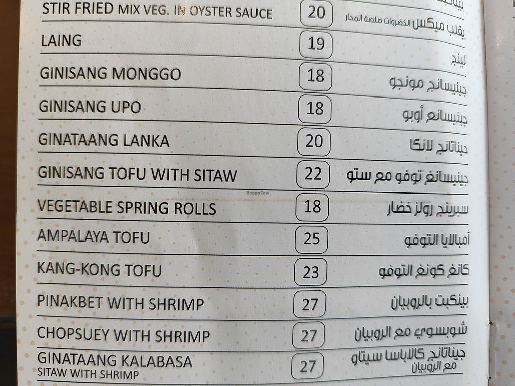 Serves meat, vegan options available. Filipino restaurant offering dishes such as ginisang tofu with sitaw, ampalaya tofu, kang kong tofu, fried tofu, and vegetable fried rice if ordered without egg. Also serves fresh fruit juices. The ground floor is wheelchair accessible, but the toilet is located on the first floor with no lift.