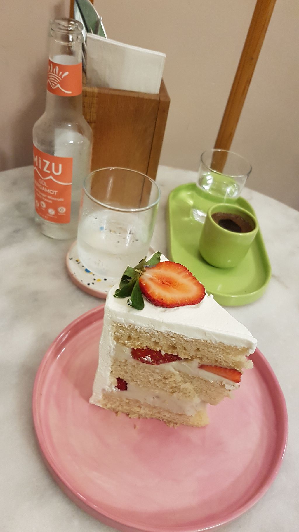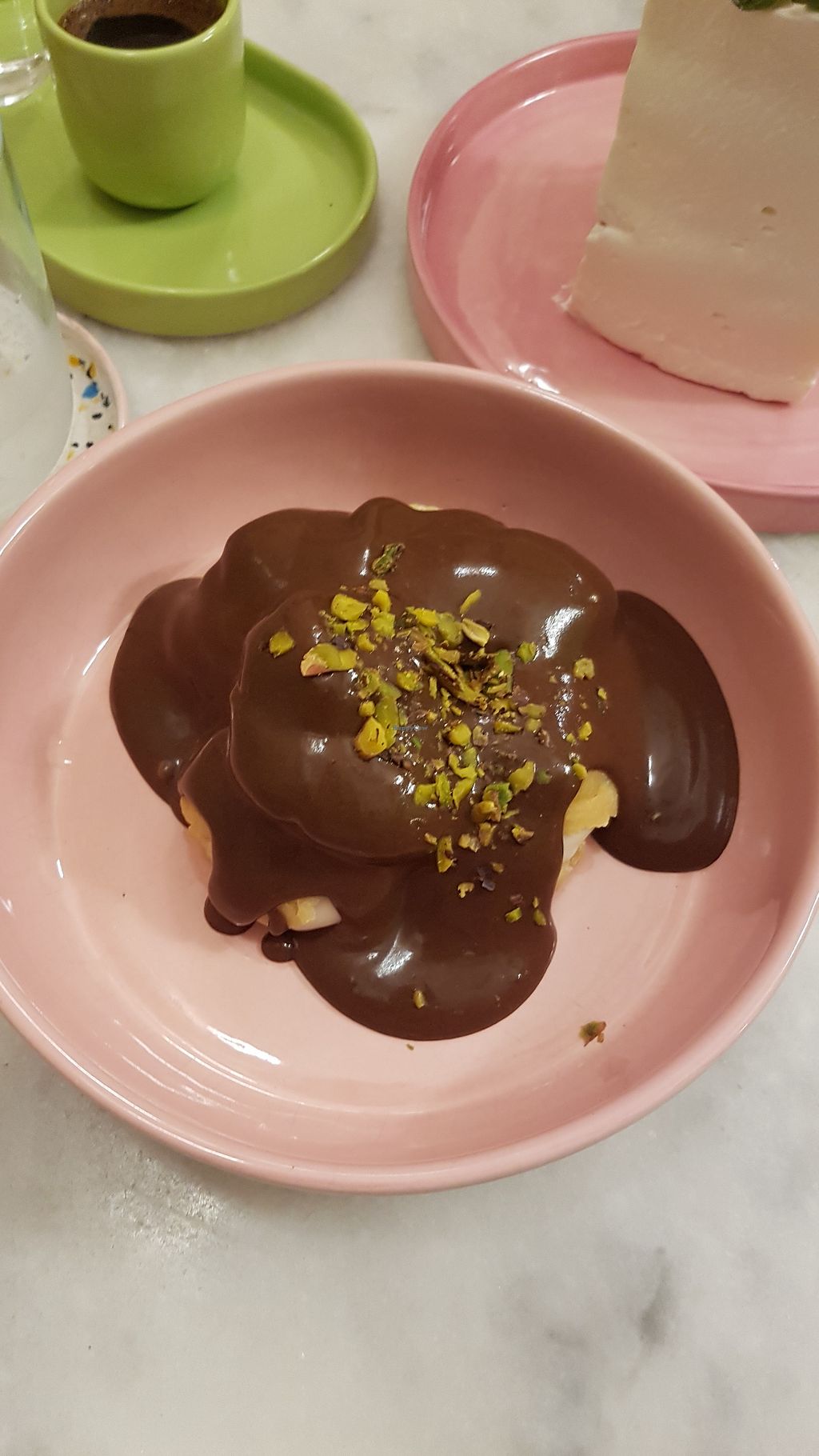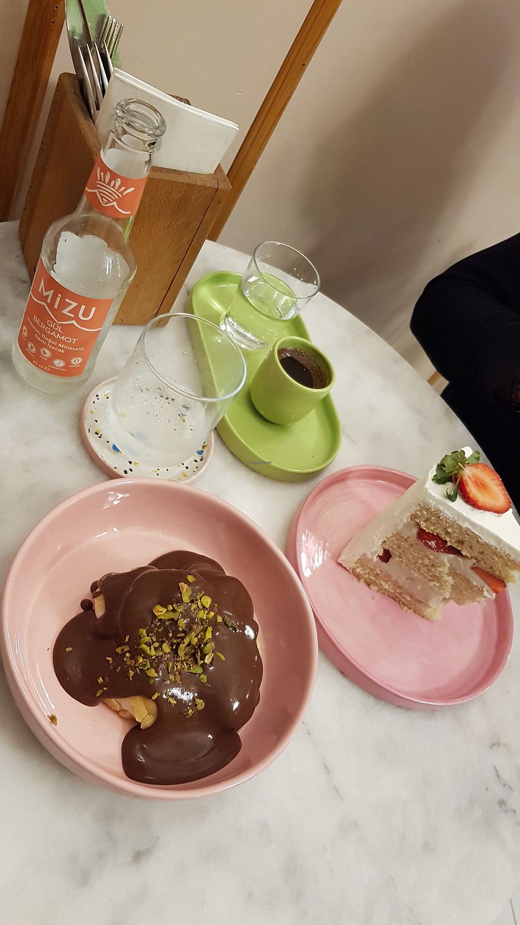 Not only is the interior gorgeous and the ceramics super pretty, staff was very friendly and welcoming. Prices seem a bit expensive (vegan ramen in opposite restaurant costs 300 TL) but the strawberry cake was sooooooo nice, very light vegan cream, and my chocolate sauce on my profiterols was really good as well. The dough was a bit tough and not as airy as I'd liked it to be, but still very recommended place.
