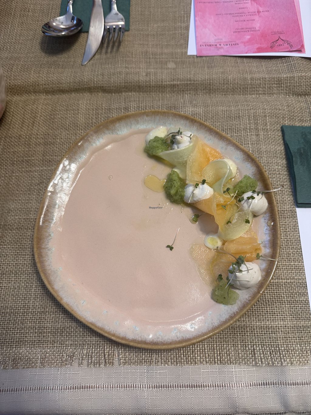 CARPACCIO FROM ÇANAKKALE: Biga Melon, Pink “Kara” Pepper Ricotta, Melon & Wild Thyme Aioli, Cucumber Granita, Sorrel