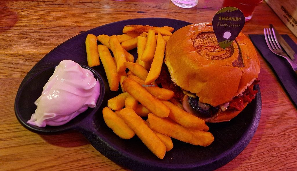 This omnivorous restaurant has a conventional menu and a completely vegan menu. The attendant communicated well in English, but this time we ordered in our “bad” German, and it worked. We ordered the burgers “Smashup! Brutal Vegan" and “Chili Cheeze Vegan", and the "Sweet Potato Fries". Both were delicious, although the amount of pepper in the "Brutal Vegan" went way over my limit, as it was overly spicy, although still tasty. So, if you order this option, beware of the "strength" of the habanero pepper. Good prices, good quantities. It was worth the experience.