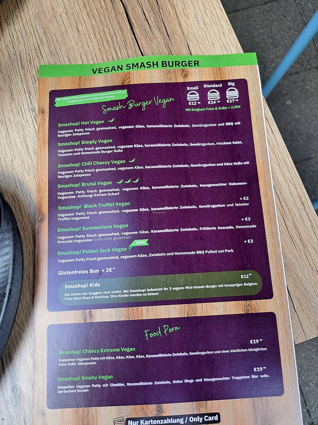 Read moreRestaurante onívoro que tem um cardápio convencional e um outro cardápio totalmente vegano. O garçom se comunicou bem em inglês, mas dessa vez fizemos o pedido com o nosso alemão ruim, e funcionou. Pedimos os hambúrgueres “Smashup! Brutal Vegan”, “Chili Cheeze Vegan” e as batatas “Sweet Potato Fries”. Ambos estavam deliciosos, embora a quantidade de pimenta no “Brutal Vegan” tenha ultrapassado e muito o meu limite, pois estava exageradamente picante, embora ainda gostoso. Então, se pedir essa opção, tome cuidado com a “força” da pimenta habanero. Preços bons, boas quantidades. Valeu a experiência.