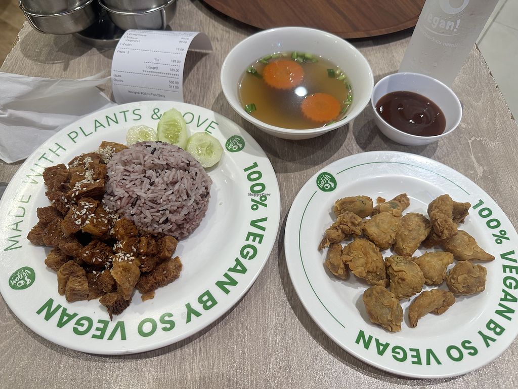 I really enjoyed my meals here and tried a variety of dishes from the ready-made dishes displayed (of which there were a lot!) as well as delivery. We even tried their vegan fried egg (the white was crispy on the edges like real egg) and a delicious drumstick on a lemongrass 'bone'. They are definitely the cheapest place I went to in Bangkok and the quality was really good, although some dishes are on the oily side. Still highly recommend it!