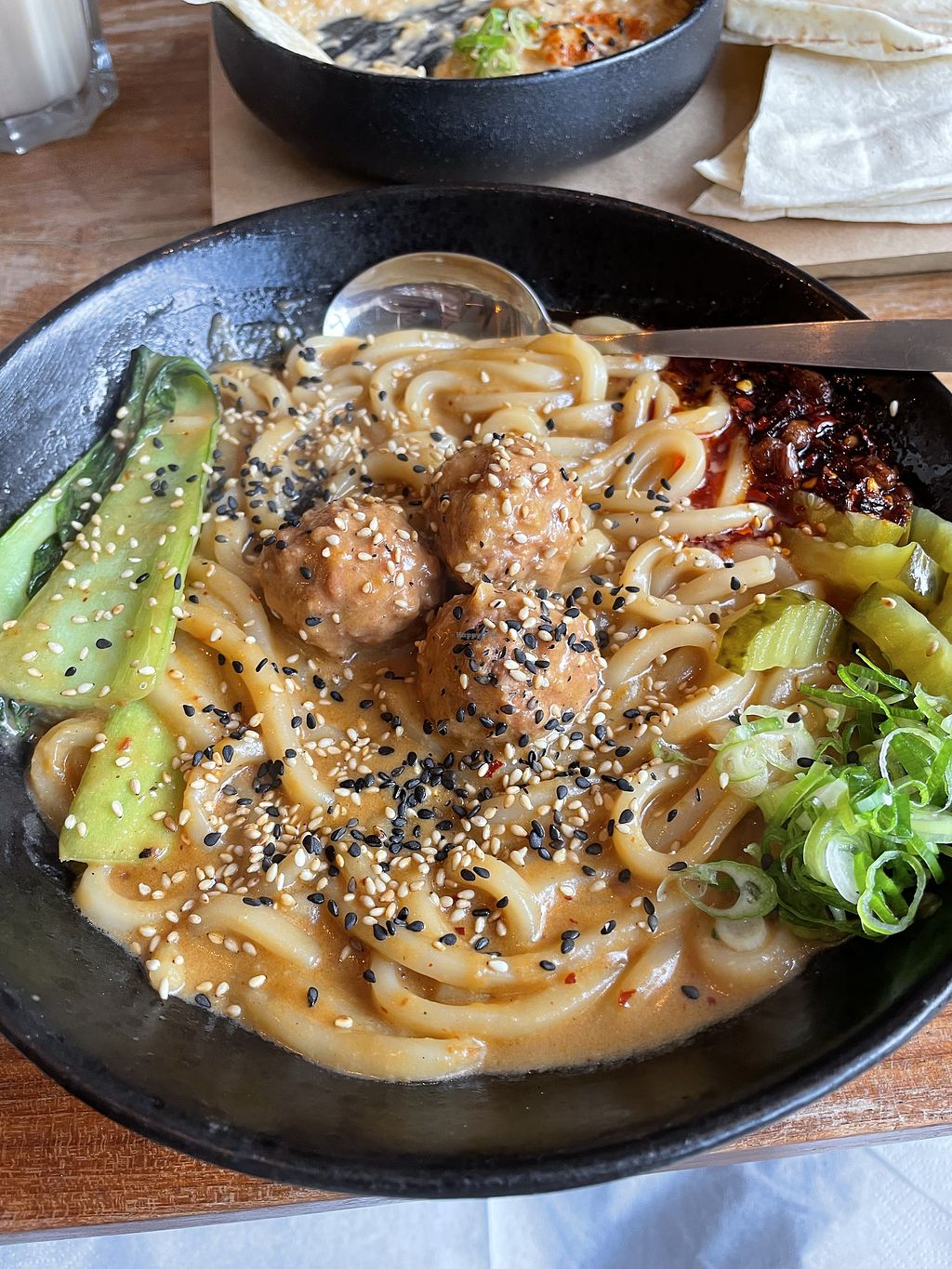 Amazing spot where had lunch. The food was delicious. The menu had a mix of noodles, ramen, rice bowls, and burgers. I ordered the Ben Ben noodles which were perfectly saucy and creamy. My partner enjoyed the Bali salad, and we shared the eggplant dip which was very tasty too. Good portion sizes, and food was very filling. Great atmosphere. 100% recommend.
