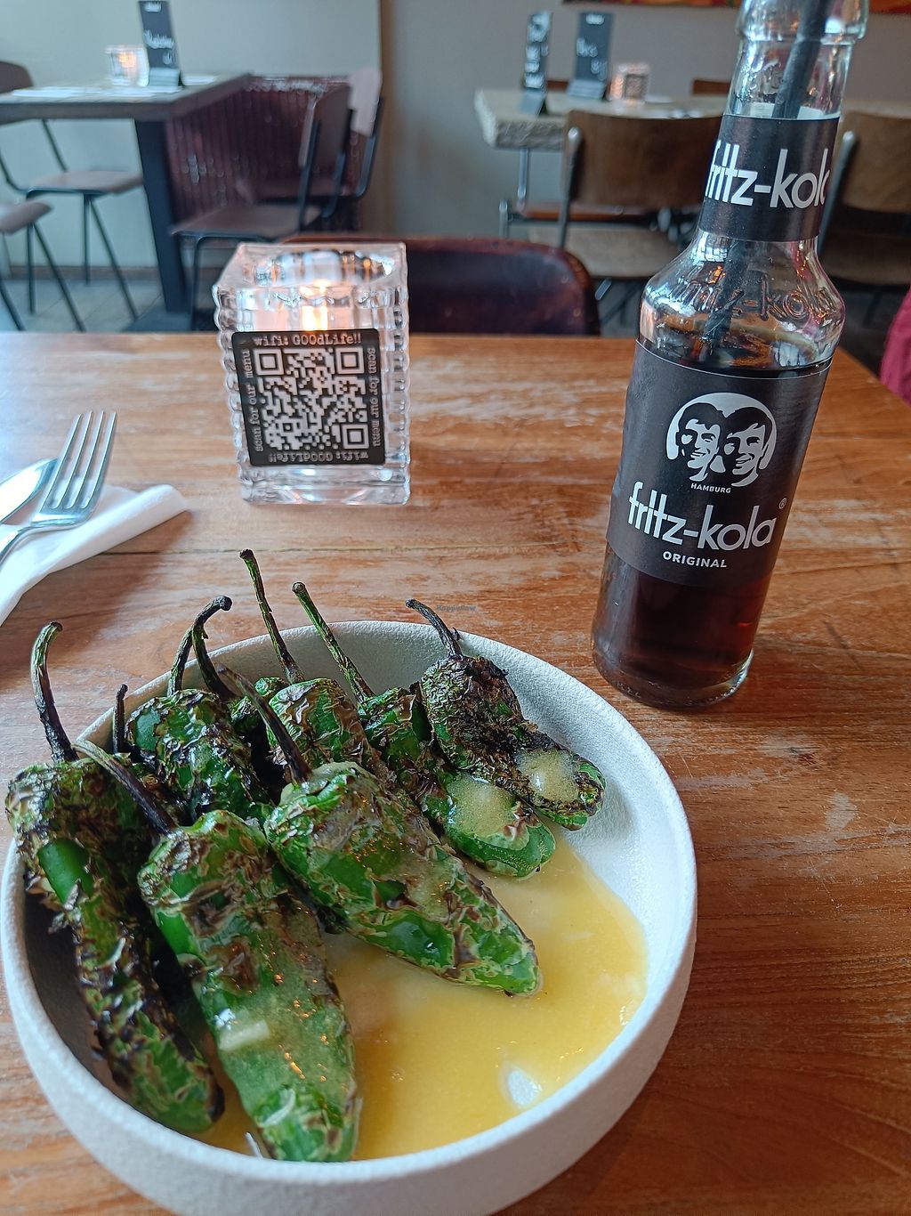 Had pimientes del padrón as a starter, a chicken burger with fries as a main and the apple pie as a dessert. All of them were uncomplicated dishes, but very good! Do take fries, they are crispy and tasty. Will come back to try more!