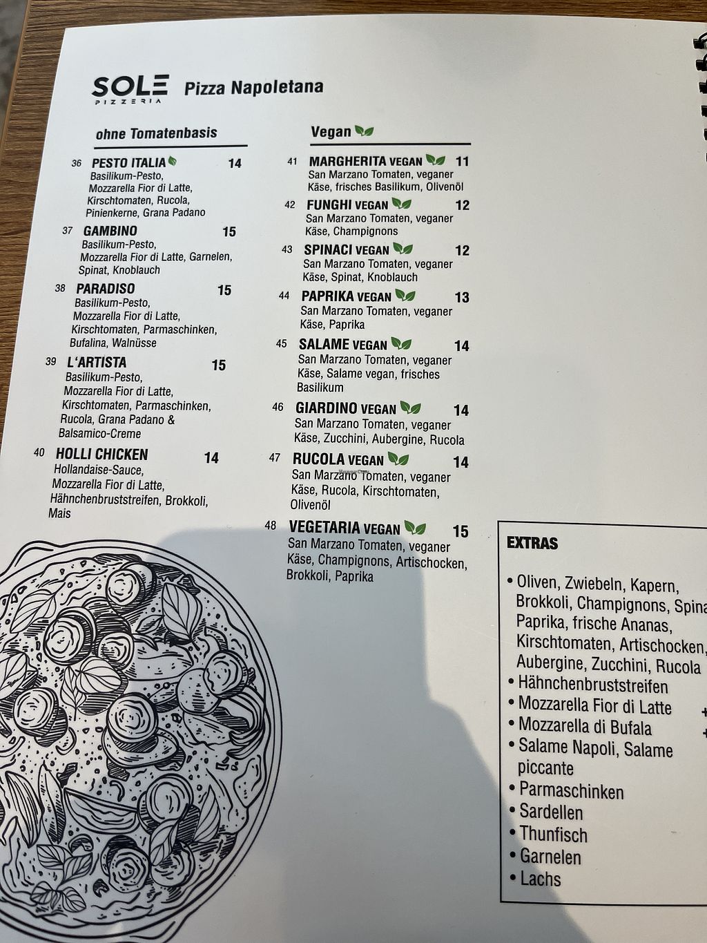 Modernes gemütliches Ambiente, eine ganze Seite im Menü mit veganen Pizzen, schnell zubereitet und in bester italienischer Pizza-Qualität.